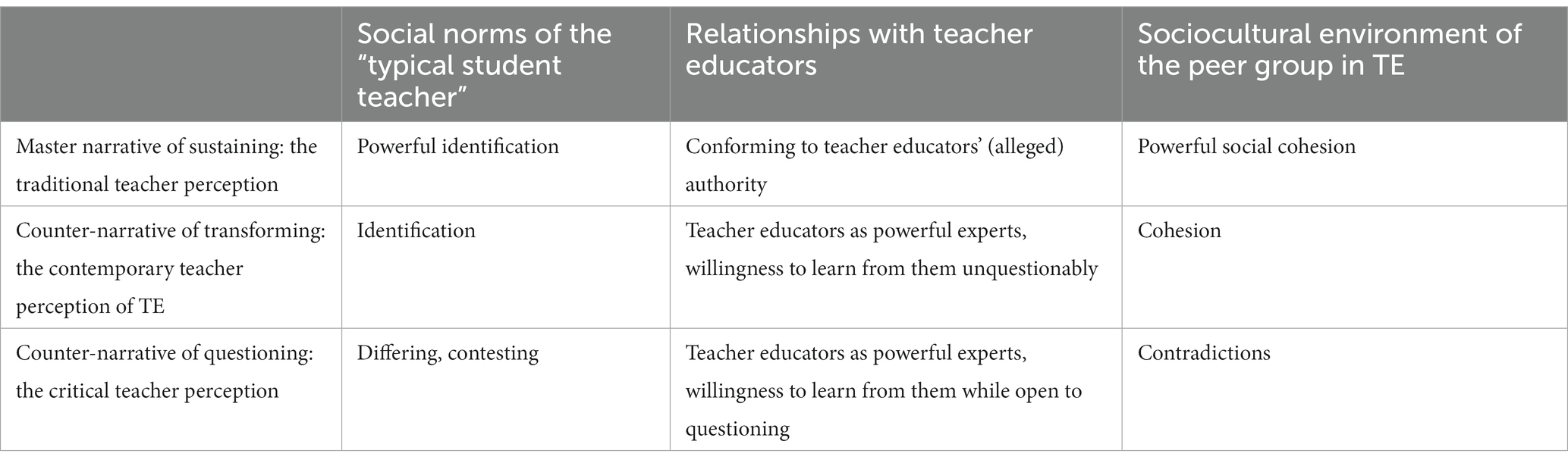 The most significant aspect emerged from the essay of the student who had used the counter-narrative of questioning in her interview when she was in her first year of studies. At that time, she already described some unofficial power relations within the peer group and contested some norms of a typical student teacher; nevertheless, she was sure of wanting to become a teacher. However, in her written essay during her fifth year, it became evident that the contradictions among her peers and with respect to the typical student teacher norm had increased during her years of studies; concurrently, she started to have self-doubts, thinking that she was too “non-teacher-like. This observation provides an important insight into what might happen if unofficial power relations were not brought to light in TE. Thus, in the Results section, we consider this finding further regarding the counter-narrative of questioning.