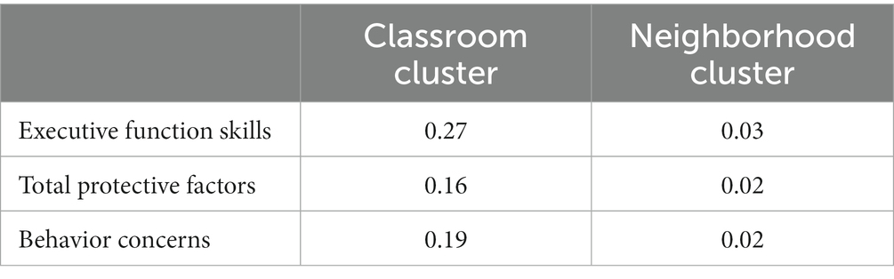Intraclass correlation coefficients (ICCs) were computed for EF and social–emotional outcomes. ICCs ranged from 16 to27% when clustering by classroom, indicating it was necessary to nest children within their classrooms. ICCs ranged from 1 to 3% when nested within the neighborhood (see Table 2). However, Moran’s I, which is a measure of how dependent geographically adjacent census tract data are based on the surrounding tracts, was significant (p < 0.05) for all six Census data indicators, ranging from 0.29 to 0.65, indicating that children should also be clustered within their neighborhood.