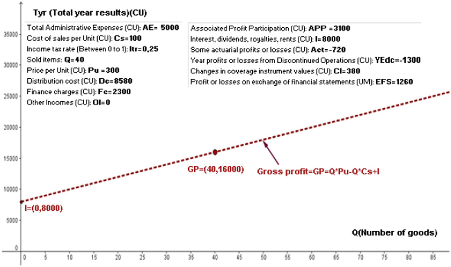 This is shown in Figure 2 by GP = (40, 16,000), which represents the value of sold articles plus the operational incomes, which can take the form of interest, royalties, and rents, without considering alternate expenses derived from ordinary activities, such as staff costs and depreciation.