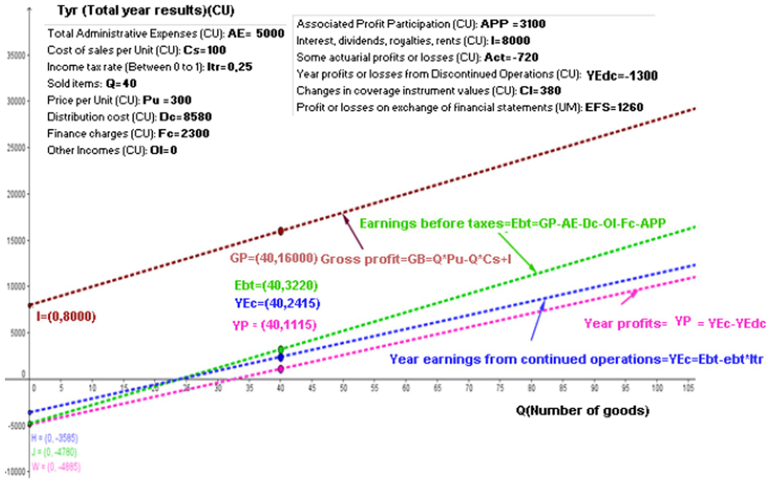 The point J = (0, − 4,800) in Figure 3 shows the intercept with the y-axis, which means that if the articles are not sold, a loss of 4,800 CU will be incurred, which is given by the sum of incomes (dividends, royalties, etc.), less the alternate expenses from ordinary activities.
