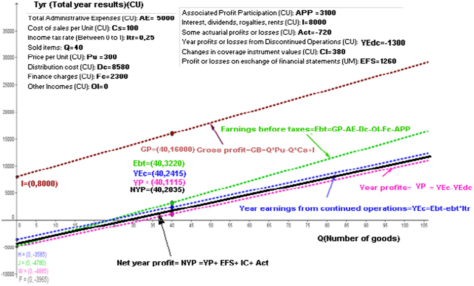 There is a company that uses the permanent inventory system as an accounting policy, does not consider inventory stock, and has a commercial activity that buys and sells a single product line. The following information is available: number of articles sold (40), product price (300 CU), cost of sales (100 CU), total administrative expenses (5,000 CU), income tax rate (25%), distribution cost (8,580 CU), financial charges (2,300 CU), other income (0 CU), associated profit participation (3,100 CU), interest, dividends, royalties, rents (8,000 CU), some actuarial profits or losses (ACT) (−720 CU), year earnings or losses from discontinued operations (−1,300 CU), changes in coverage instrument (CI) values (380 CU), and profit or losses resulting from the exchange of financial statements (1,260 CU).