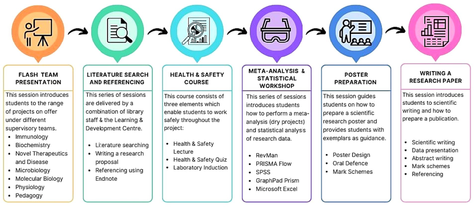 Figure 2. A diagrammatic overview of the project support sessions. The students are introduced to the variety of projects available during the flash team presentation, once the students have selected their project they are supported with literature searching and referencing workshops, followed by a health and safety course. As the project module progresses, students are expected to attend the meta-analysis and statistical analysis workshop, as well as the poster presentation workshop. Finally, students are given a workshop on how to write a research paper. The structure of the programme supports students throughout the academic year, helping them prepare for the module assignments.