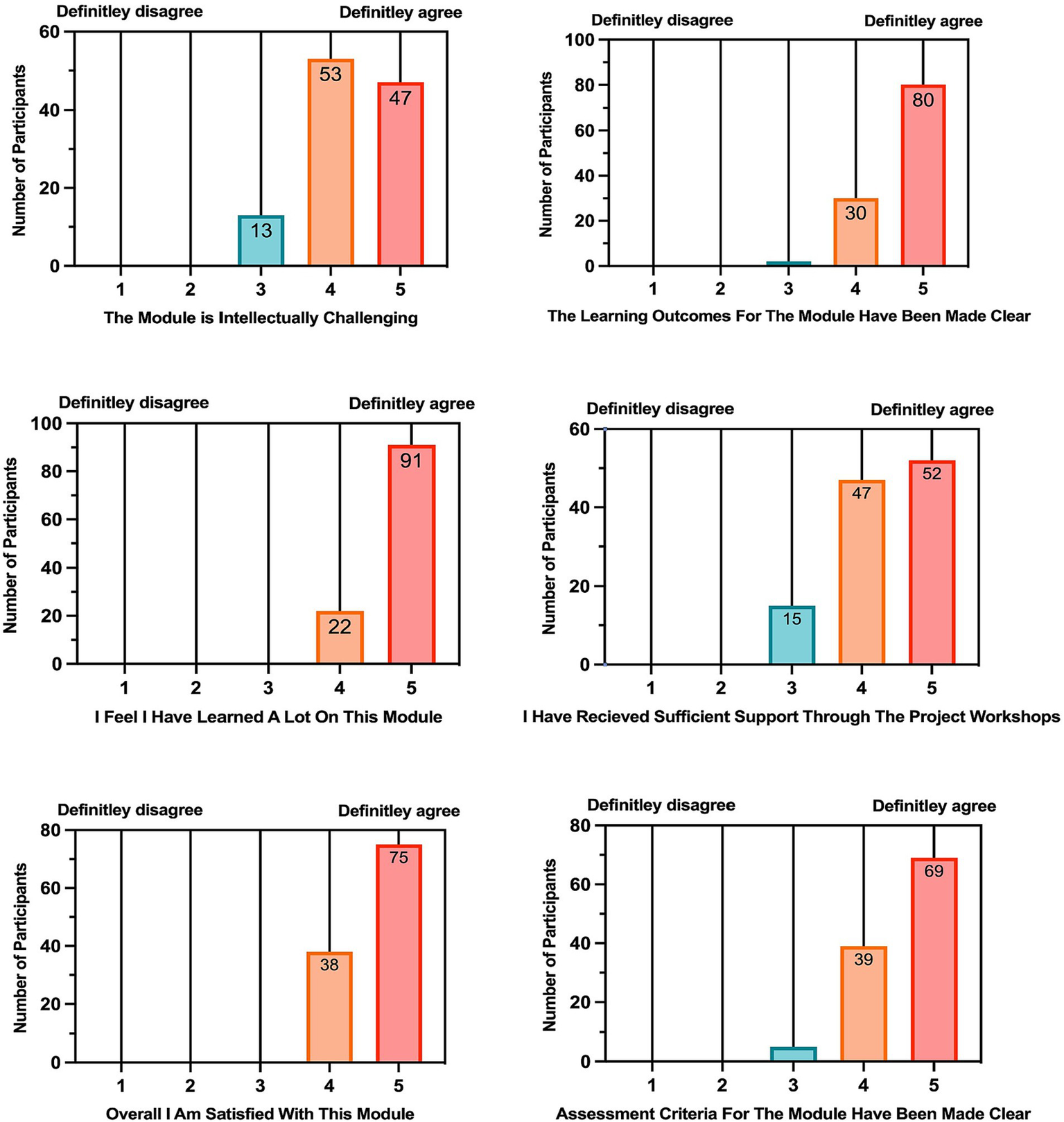 Figure 3. End of module feedback for the final year project module. Data were collated from end-of-module feedback reports, asking students to express whether they definitely disagreed (1), disagreed (2), neither disagreed nor agreed (3), agreed (4) or definitely agreed (5) with a series of statements assessing the quality of the final year project module. Data presented as the number of participants (n = 113) out of 179 total students. Data is representative of the academic year 2021–2022.