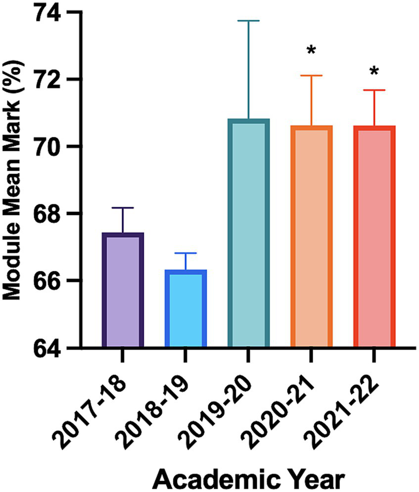 Figure 5. Mean module mark for the final year project module. Data presented herein highlight the mean module mark ± SD of the final year project module from the academic year beginning 2017 up until 2022. Academic years 2017–2019 saw the previous iteration of the project module and the re-design was first introduced in the academic year 2019 and was continuously delivered up to the academic year ending 2022. In comparison to the academic year ending in 2019, the mean module mark has significantly increased following the re-design of the module. A one-way ANOVA, with multiple comparisons and Tukey’s post hoc test was used to compare all possible pairs and determine the statistically significant increase in the mean module mark observed in academic years 2020 to 2022, p = 0.04 and p = 0.03. 2021–2022 cohort size 179, 2020–2021 cohort size 170, 2019–2020 cohort size 168, 2018–2019 cohort size 165 and 2017–2018. *symbol denotes a statistically significant difference (p ≤ 0.05) in the mean module mark in comparison to the academic year ending in the year 2019. This was observed in the academic year 2020–21 and 2021-22.