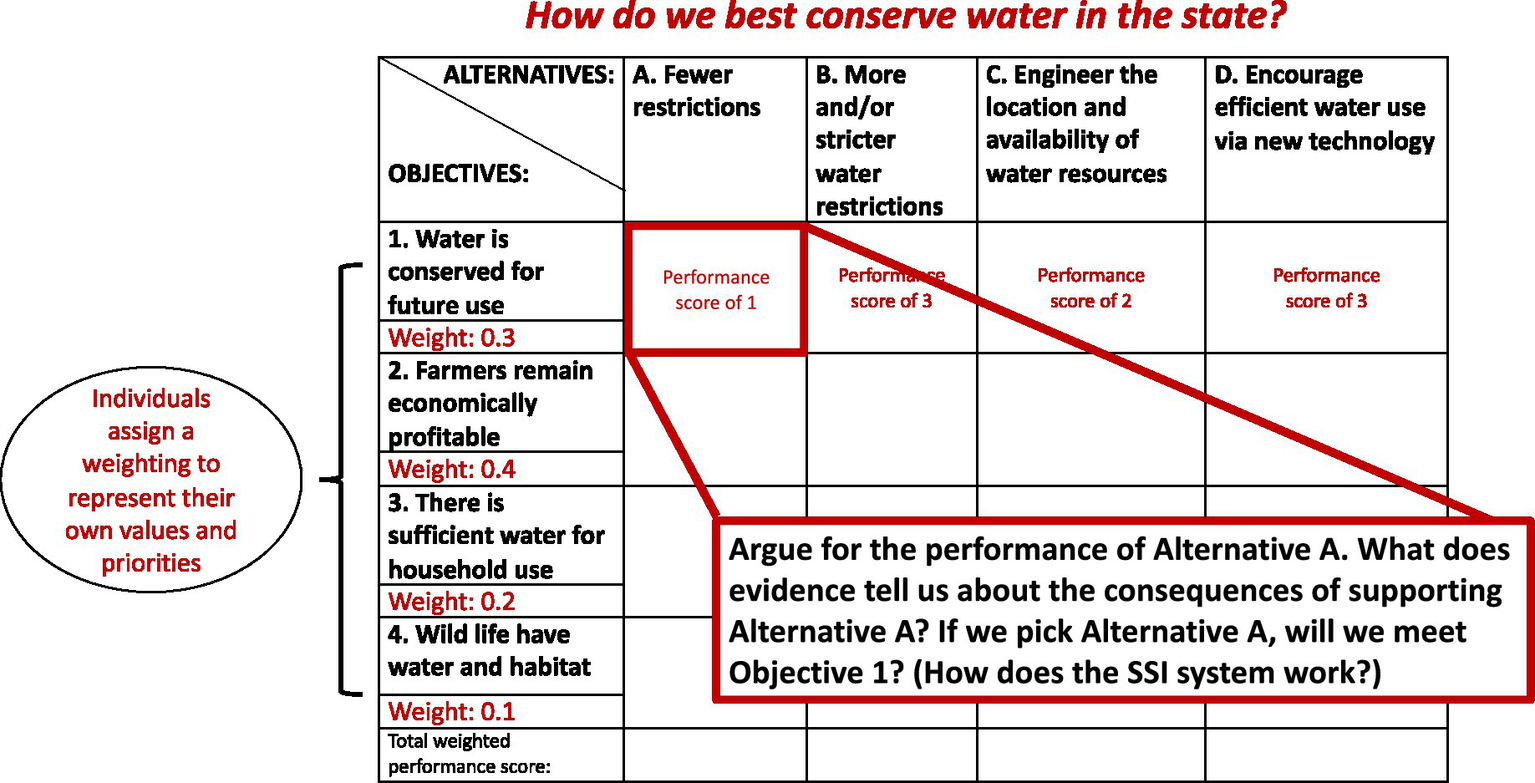 A science literacy course, [blinded] in a large Midwestern university, incorporated a structured decision making (SDM) process, which served as an external representation of students’ reasoning about SSI, and was designed to improve students’ decision making and information literacy practices (Ratcliffe, 1997; Kolstø, 2001; Grace, 2009; Acar et al., 2010). The SDM process (Gregory et al., 2012; Hammond et al., 2015) used was a stepwise process that is published elsewhere (Dauer et al., 2017, 2022; Alred and Dauer, 2020; Jimenez et al., 2023). Several SSI-contexts were used in the SDM context throughout the class semester. We collected data during the final iteration of the SDM in an SSI framed as “how do we conserve water in the state?” At the start of the SSI module, instructors defined the issue through a general background of the SSI. Then students proposed desired goals that were collated by the instructor into four discrete Objectives (Figure 1). Students assigned weights to the four student-generated Objectives based on how personally important each Objective is; the weights’ sum must equal one. Third, instructors presented.