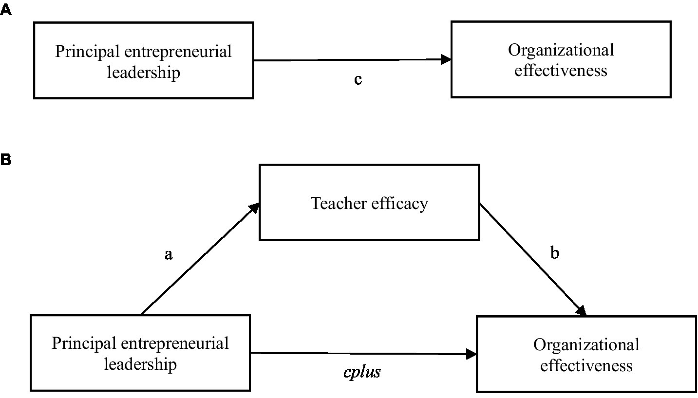 Principals exert influence on teachers through the role of ideological leading, action guidance, and inspiring encouragement directly, and on students via curriculum goal planning, teacher teaching supervision, and school climate indirectly. Meanwhile teachers act as a bridge between principals and students directly affecting students’ achievement and organizational performance. According to previous research, teacher efficacy is related to principal leadership and school performance (Denham and Michael, 1981; Burke and Reitzes, 1991). The characteristics as well as behaviors of principal entrepreneurial leadership supervise and control the teaching quality of teachers’ classroom management and student engagement, also enhance the self management and self efficacy in teaching activities (Mishra and Misra, 2017). Student achievement progress and high satisfaction, faculty and teacher satisfaction represent the high organizational effectiveness (Croucher et al., 2017). High-practice leadership will facilitate teacher’s working performance and achieve high teachers’ self-efficacy, improving students’ satisfaction with the organization’s performance (Zheng, 2002; Zhang et al., 2020; Wang et al., 2022). Although there is no direct evidence that teacher efficacy has a mediating effect between principal entrepreneurial leadership and organizational effectiveness, some scholars have found that teacher efficacy mediates different types of principal leadership and organizational performance (Teh et al., 2015; Yasin, 2017; Liu et al., 2022). It is reasonable to infer that teacher efficacy is affected by principal entrepreneurial leadership, which in turn, affects organizational effectiveness. Therefore, this study propose four hypotheses: