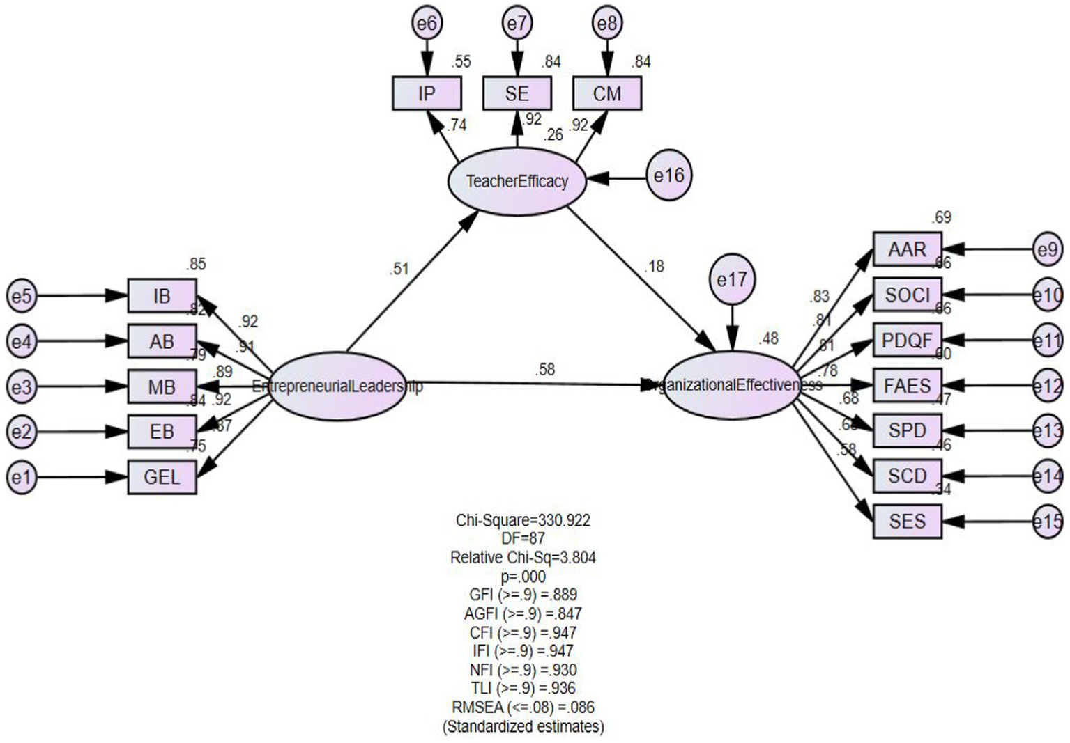 After the confirmatory factor analysis process, organizational effectiveness consists of seven dimensions with 26 items (Appendices 3–5), and the model fit indices are decent (Chi-Square = \CMIN = 906.404, CMIN/DF = 3.094, RMSEA = 0.074, CFI = 0.893, TLI = 0.882). Next, principal entrepreneurial leadership was structured with five dimensions with 48 items. The model fit indices are decent (Chi-Square = \CMIN = 2540.080, CMIN/DF = 2.354, RMSEA = 0.060, CFI = 0.881, TLI = 0.876). Teacher efficacy consists of three dimensions with 16 items and the model fit indices are satisfactory (Chi-Square = \CMIN = 327.737, CMIN/DF = 3.151, RMSEA = 0.075, CFI = 0.920, TLI = 0.908). Based on the total measurement model, the model fit indices are reasonable (Chi-Square = \CMIN = 7057.278, CMIN/DF = 1.852, RMSEA = 0.047, CFI = 0.855, TLI = 0.847). The reliability and discriminant validity of the total measurement model are shown in Appendix 6. The structural model with 15 latent dimensions indicates that the model fit indices are at an acceptable level as well (Chi-Square = \CMIN = 330.922, CMIN/DF = 3.804, RMSEA = 0.086, CFI = 0.947, TLI = 0.936). Table 2 presents the path correlation verification. And Figure 2 shows the structural model result.
