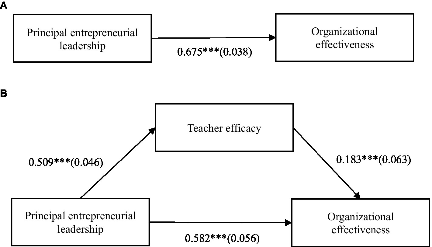 In Table 3, both direct effects and indirect effects are significant (p < 0.05), and the mediation model is a partial mediating effect. The indirect effects (IE) estimate value is 0.094, with a 95% confidence value (0.037, 0.155) that does not include 0, thus the indirect effect is valid. The direct effects (DE) estimate value is 0.583, with a 95% confidence value (0.468, 0.698) that does not include 0, the direct value is also valid. The effect proportion of indirect effect is 13.9% and the effect proportion of direct effect is 86.1%. The direct effect of principal entrepreneurial leadership on organizational effectiveness is significant without the teacher efficacy mediator (β = 0.675, SE = 0.038, p < 0.001). Hence, for the fifth hypothesis, it is evident that teacher efficacy plays a partial mediates the relationship between principal entrepreneurial leadership and organizational effectiveness in English training institutions. Figure 3 shows the direct model and mediation model results.