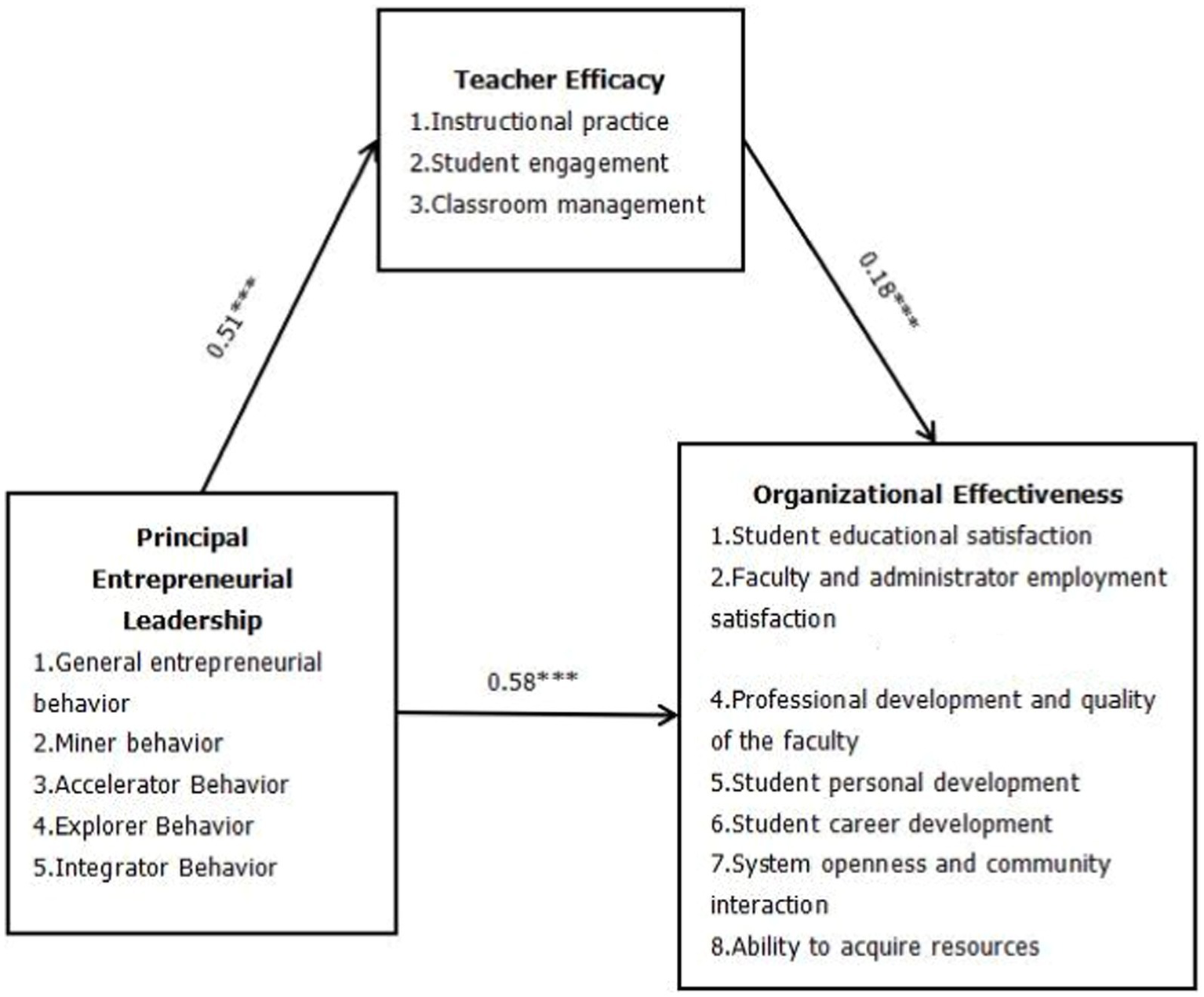 The results are based on the positively significant Pearson correlation and path relationship analysis among principal entrepreneurial leadership, teacher efficacy and organizational effectiveness. The first hypothesis is supported where principal entrepreneurial leadership has a significant positive relationship with organizational effectiveness in English training institutions (β = 0.582, p < 0.001). For the second hypothesis, it is also supported where the finding shows that teacher efficacy has a significant positive relationship with organizational effectiveness in English training institutions (β = 0.183, p < 0.001). The third hypothesis is supported where principal entrepreneurial leadership has a significant positive relationship with teacher efficacy in English training institutions (β = 0.509, p < 0.001).