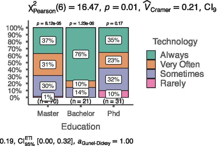 In terms of educational attainment, a statistically significant difference was also observed (p = 0.011), indicating that educational levels are associated with different patterns of technology use. Interestingly, individuals with PhD were most likely to “rarely” use technology (75.0%), while those with a master’s degree led in the “sometimes” (61.8%) and “very often” (71.0%) categories. Bachelor’s degree holders, although the least represented overall, had a substantial presence in the “always” category (30.2%).
