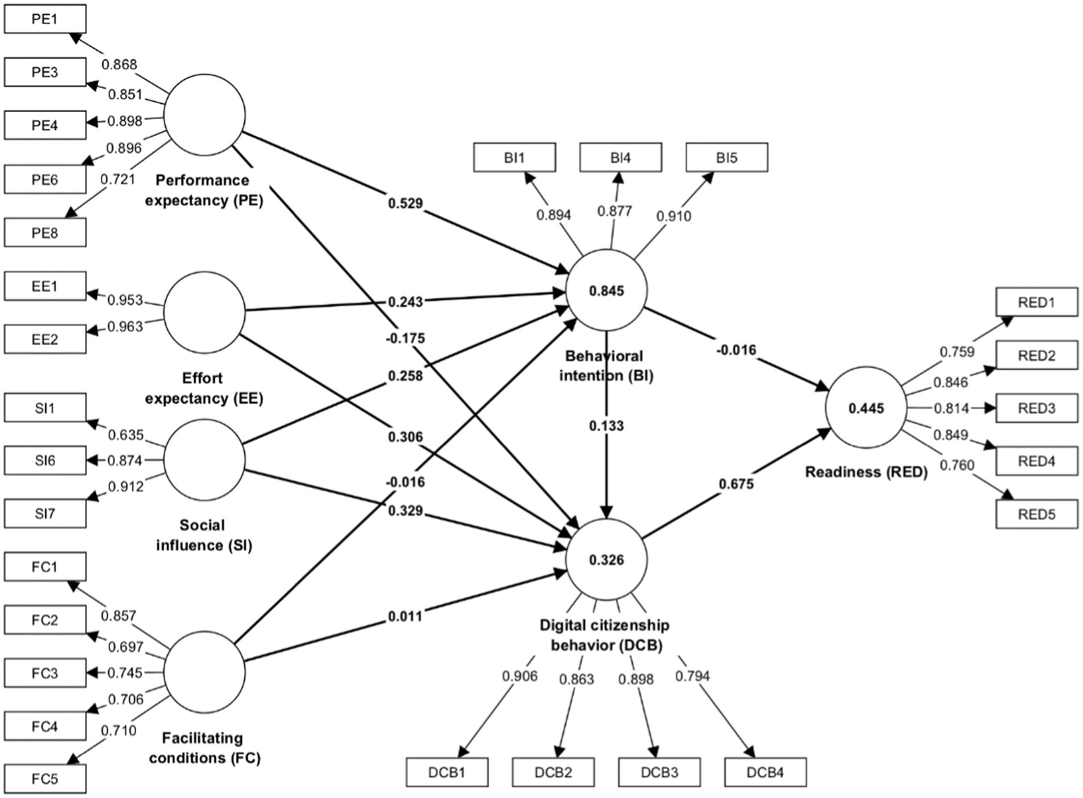 The findings confirmed eight significant paths of relationships, highlighting the importance of inputs such as effort and social influence and their impact on performance as an output in determining faculty readiness. However, the study raised empirical doubts about the remaining 20 hypotheses, providing new evidence that challenges the currently established relationships between technology acceptance and digital citizenship.