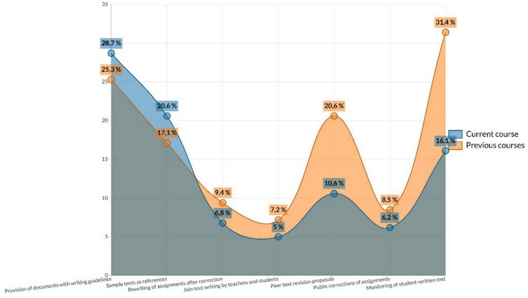 Likewise, the analysis of the data obtained in the questionnaire shows that feedback in academic practices emerges as a crucial aspect of academic training. The perception of the effectiveness of constructive feedback varies among students. A high percentage (74.3%) value it positively, as regular monitoring and systematic review help to identify areas for improvement, as well as to understand how to strengthen their textual production skills. This support is also perceived as an element that favors students’ motivation, involvement and commitment to the development of academic writing skills.