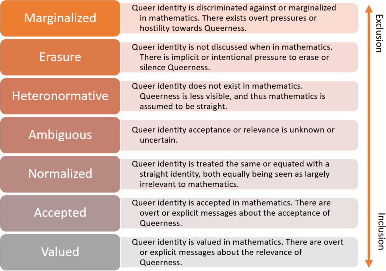 I identified seven prominent discourses relating to how Queer identity was positioned within math environments. The seven discourses are not necessarily disjoint, since social discourses are context specific and constantly shaped by institutions, individuals, and society (Foucault, 1977; Gutiérrez, 2013). Yet examining the features of these social discourses, reveals the taken-for-granted assumptions about Queer identity in mathematics and how that contributes to power and positioning of Queer students as mathematical learners. Three of the discourses, which were the most prevalent, limit the capacity of students to position themselves as Queer mathematical learners, manifesting in oppressive and exclusionary power relations. These discourses are referred to as Marginalized, Erasure, and Heteronormative. One of the discourses, referred to as the Ambiguous discourse, conveys neither exclusionary nor inclusionary beliefs about Queer identity in mathematics. Three of the discourses promote the capacity of students to position themselves as Queer math learners, manifesting in more productive and inclusionary power relations. These discourses are referred to as Normalized, Accepted, and Valued. The seven discourses represent belief systems that range from the most exclusionary to students’ Queer identity (Marginalized) to the most inclusionary (Valued) which is depicted in Figure 2.