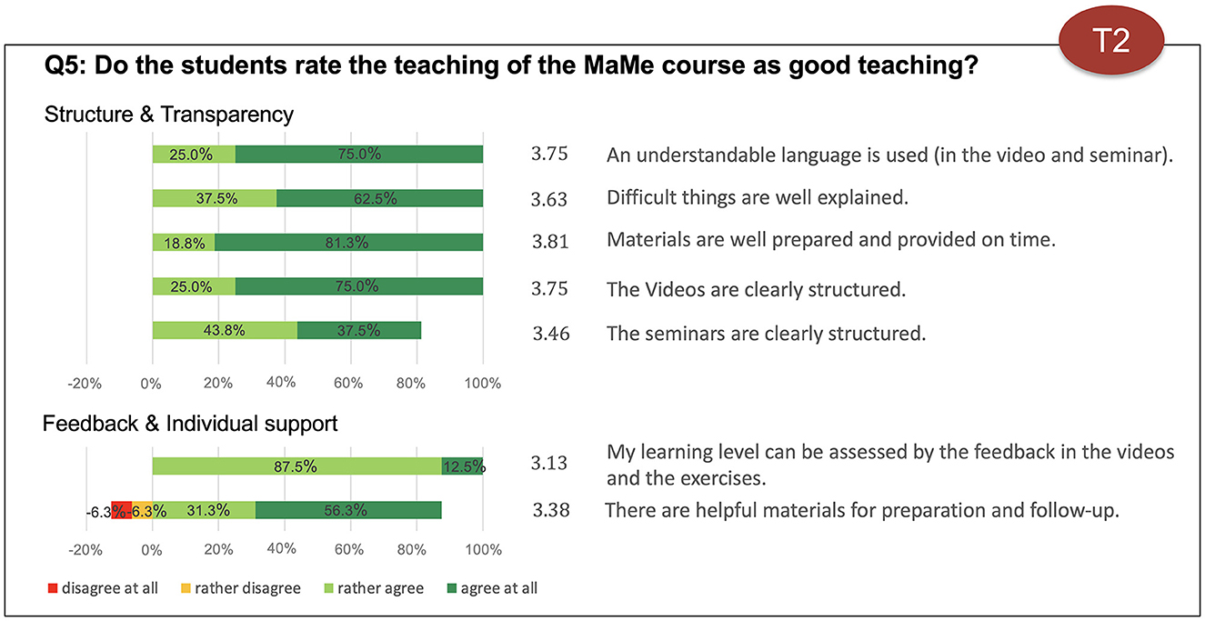 The quality of teaching has two dimensions, structure and transparency and feedback and individual support. Figure 6 shows that the students rated all seven items of the survey according to Q5 predominately positive with scores of μ>3. The key aspects of quality of structure and transparency, comprehensible language (μ = 3.75, σ = 0.11) and the ability to explain difficult issues simply (μ = 3.63, σ = 0.23) were evaluated by the students as very good. The materials and videos were well prepared and provided in time (μ = 3.81).