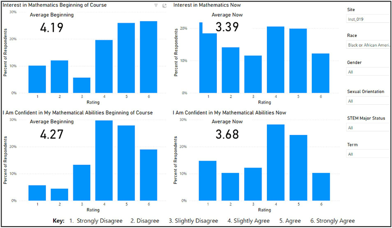 Figure 3. Data dashboard results for interest and confidence in math, filtered for Black or African American students at Tau University, that Tau NIC explored during a meeting.