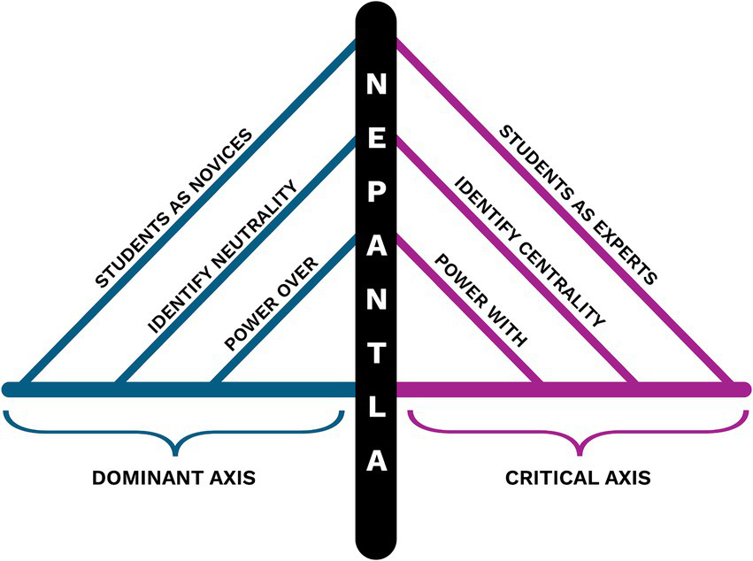 Gutiérrez (2009) draws on the indigenous Nahuatl word nepantla to emphasize the tensions that exist within the intersection of the dominant and critical axis, as shown in Figure 1. Nepantla describes the in-between, liminal space between worlds. Anzaldúa (2002) states that “transformations occur in this in-between space, an unstable, unpredictable, precarious, always-in-transition space lacking clear boundaries,” and that nepantla is associated with “being in a constant state of displacement - an uncomfortable, even alarming feeling” (p. 243). Gutiérrez (2015) emphasizes the power of these tensions: we will experience tensions within this transformative and liminal space of nepantla, but these tensions are necessary to critically transform mathematics education.