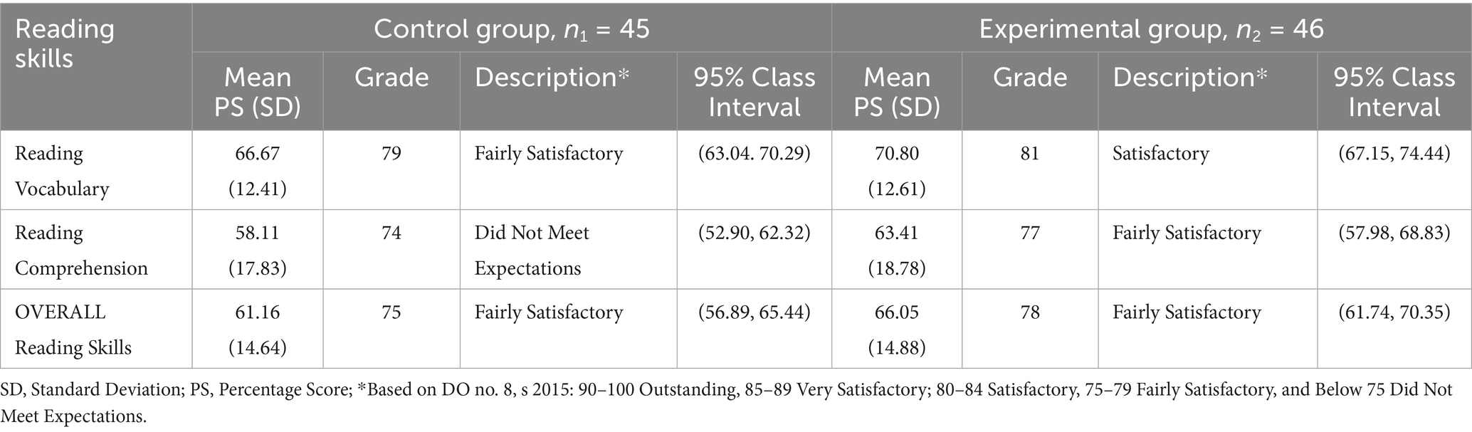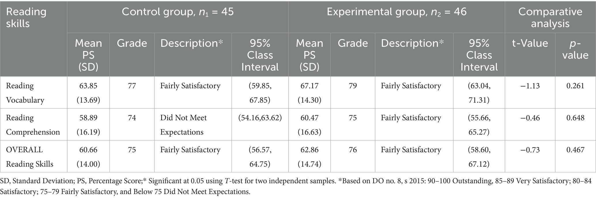 Table 1 presents the pre-reading skills of students in the control (n = 45) and experimental (n = 46) groups before the intervention. Both groups were generally at the Fairly Satisfactory level based on the Department of Education grading scale. For reading vocabulary, the control group obtained a mean percentage score of 63.85, while the experimental group scored slightly higher at 67.17; however, this difference was not statistically significant (t = −1.13, p = 0.261). In reading comprehension, the control group scored 58.89 (Did Not Meet Expectations) and the experimental group scored 60.47 (Fairly Satisfactory), but the difference likewise was not significant (t = −0.46, p = 0.648). For overall reading skills, both groups fell within the Fairly Satisfactory level (Control: 60.66; Experimental: 62.86), with no significant difference observed (t = 0.73, p = 0.467). These results confirm that the two groups were comparable in their reading performance prior to the intervention, thereby providing a sound basis for subsequent comparisons of post-test outcomes.