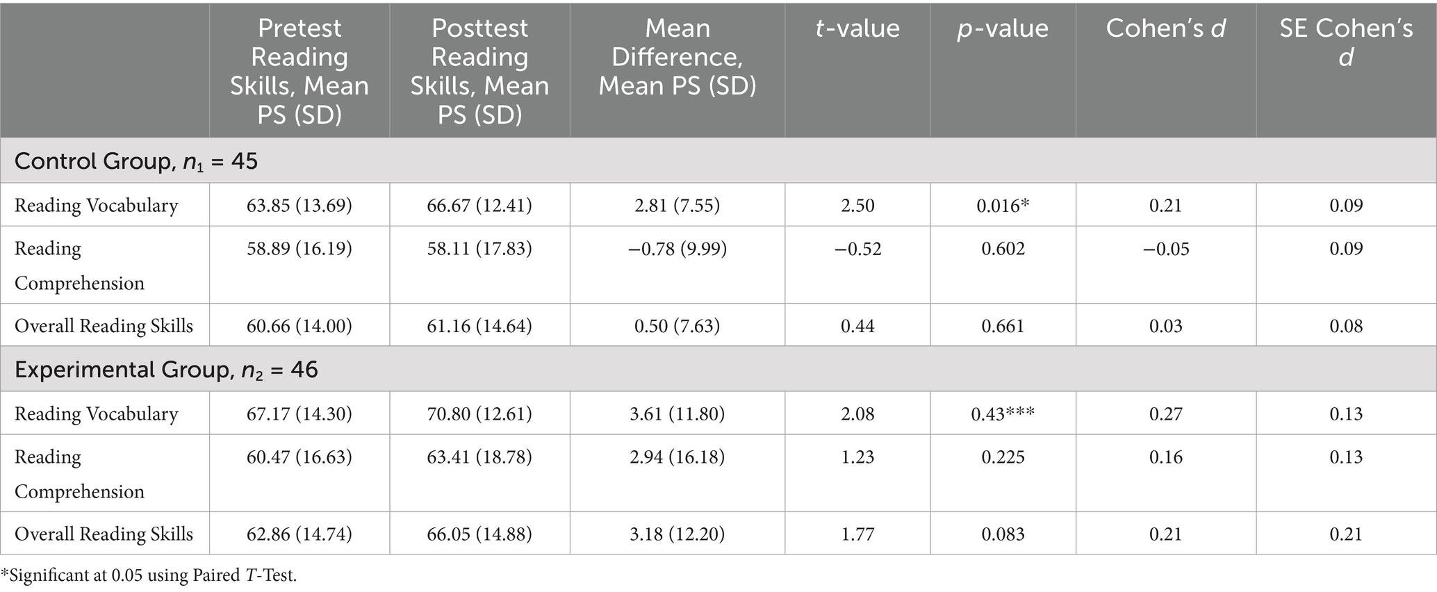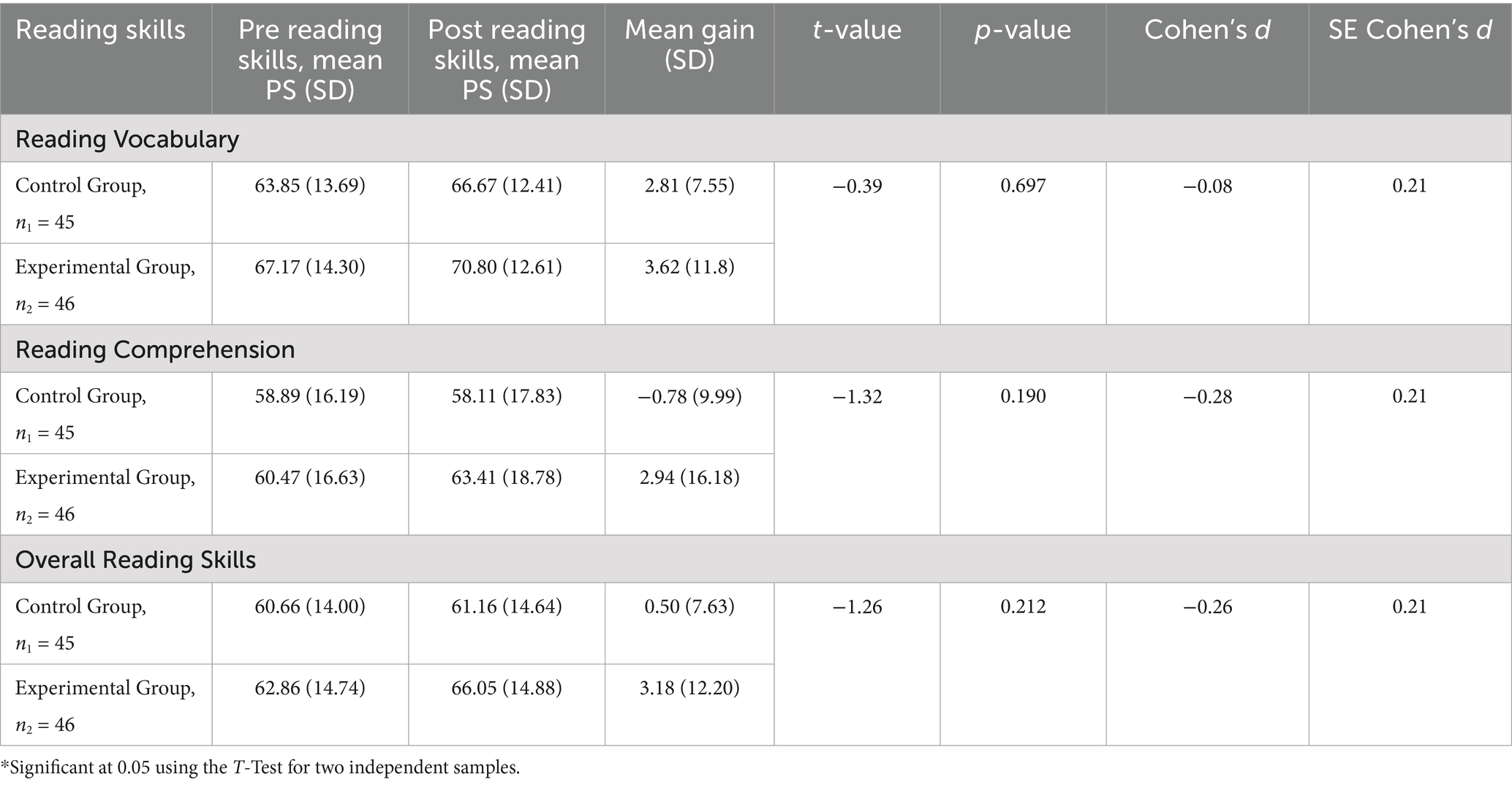 Table 3 shows the comparative analysis of pre- and post-test results on reading skills within the control and experimental groups. In the control group, a significant improvement was observed in reading vocabulary (t = 2.50, p = 0.016) with a small effect size (d = 0.21), indicating a modest gain in vocabulary knowledge. No significant changes were noted in reading comprehension (p = 0.602, d = −0.05) or in overall reading skills (p = 0.661, d = 0.03), suggesting stable performance in these areas. Similarly, in the experimental group, reading vocabulary significantly increased (t = 2.08, p = 0.043) with a small effect size (d = 0.27), while no significant improvements were found in reading comprehension (p = 0.225, d = 0.16) or overall reading skills (p = 0.083, d = 0.21). Taken together, the results indicate that both groups demonstrated slight but meaningful gains in reading vocabulary, while comprehension and overall reading ability remained relatively unchanged.