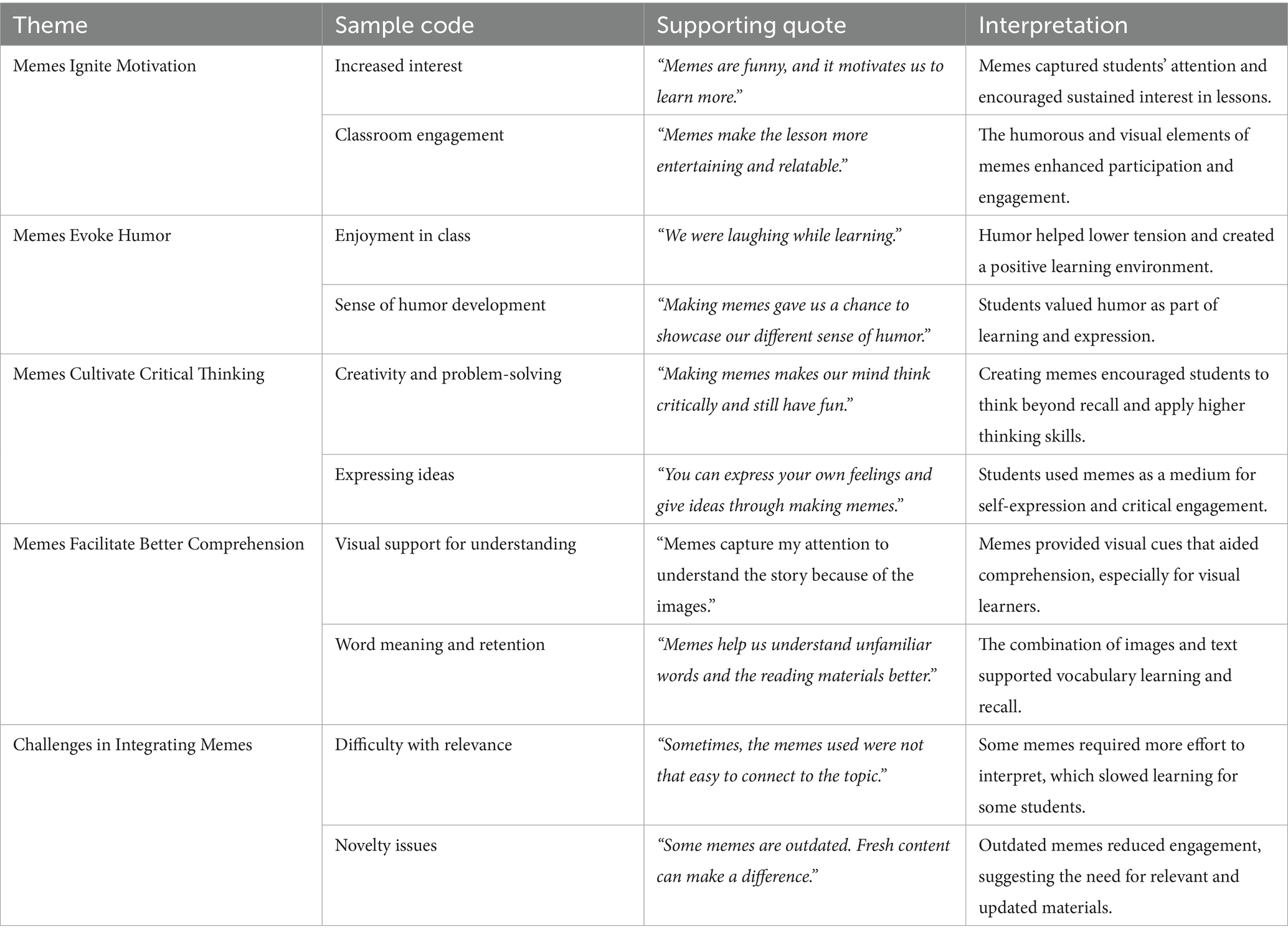were reviewed, refined and named to capture the patterns that reflected students’ experiences with the use of memes. Codes and themes were finalized through iterative discussions among the researchers to ensure credibility. To strengthen trustworthiness, sample codes, excerpts, and their alignment with emerging themes are presented in Appendix. Reliability in coding was established through intercoder checking. Two researchers independently coded a subset of the transcripts and compared results. Differences in coding were discussed and resolved until consensus was reached, and the agreed coding was applied to the rest of the data. This process helped minimize bias and ensured consistency in the interpretation of results.