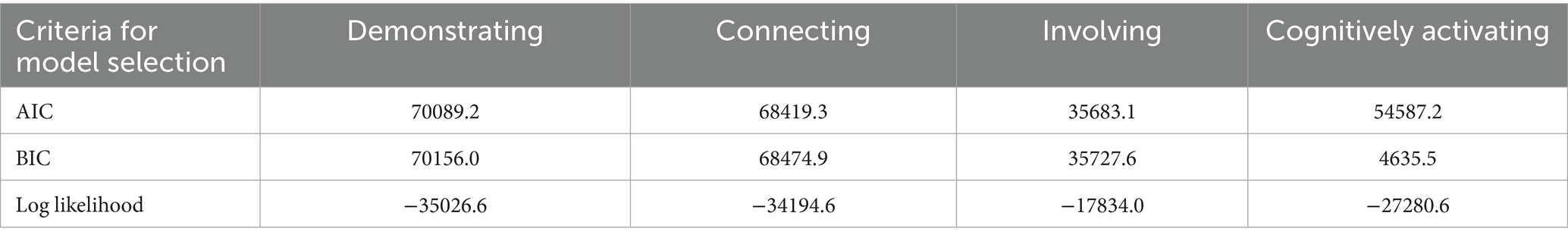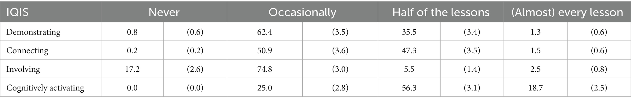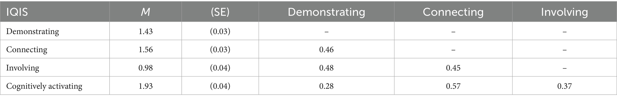 The internal consistency for the present sample was Cronbach’s α = 0.69 for demonstrating, α = 0.64 for connecting, α = 0.91 for involving, and α = 0.79 for cognitively activating, which is in the acceptable range and thus within the range of the reference studies (Wagner et al., 2016). Table 3 shows descriptive associations and intercorrelations for the IQIS scales.