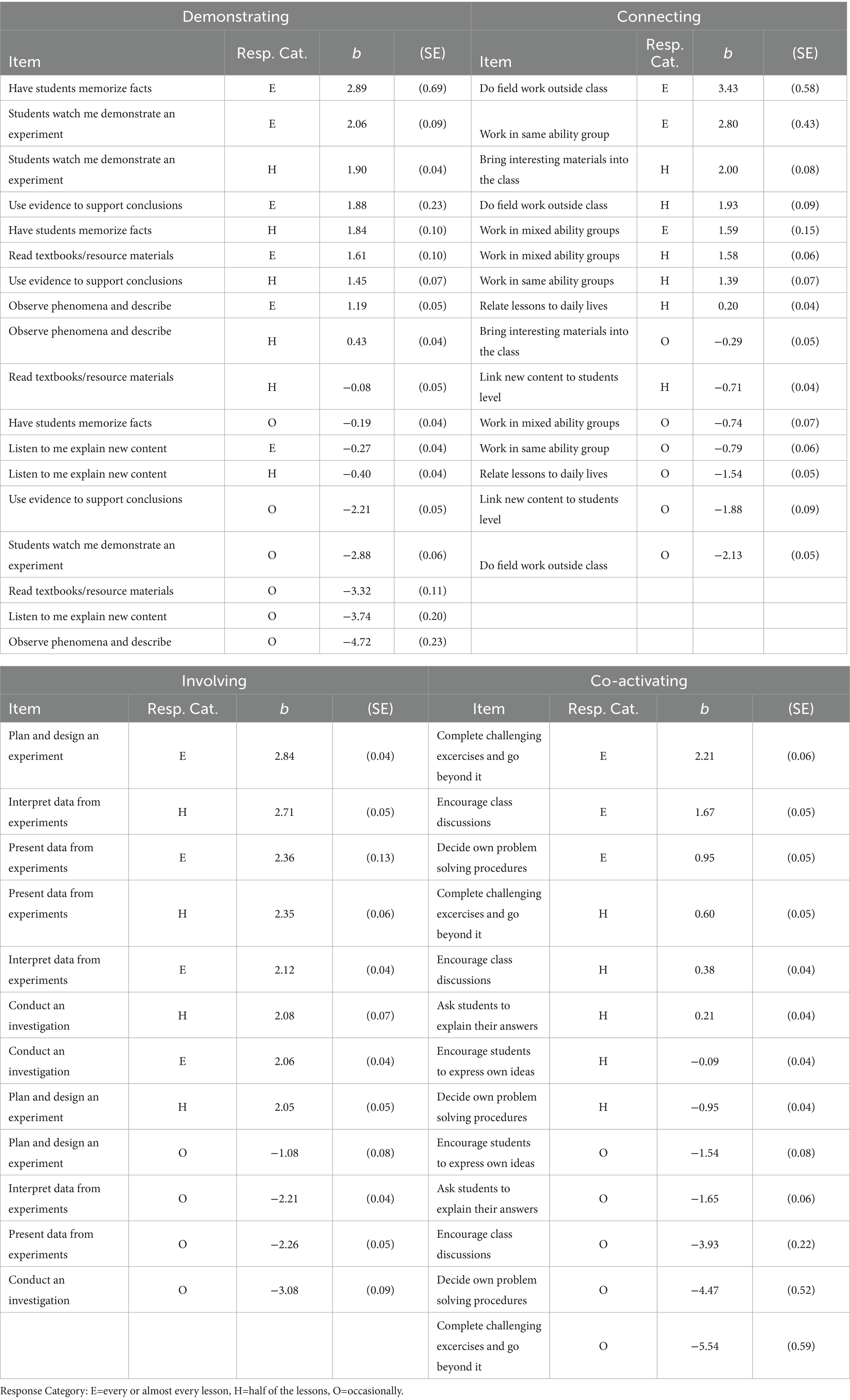 Furthermore, we find some significant effects for the covariates of teacher quality, but without a clear pattern across all scales. Experienced teachers are less active in applying connecting activities than inexperienced teachers (model 4). Teachers who report having participated in specific training programmes on critical thinking or inquiry-based skills report less frequent use of demonstrating and involving strategies. On the other hand, more frequent participation in further training in science is associated with a higher likelihood of using all four IQIS strategies more frequently.