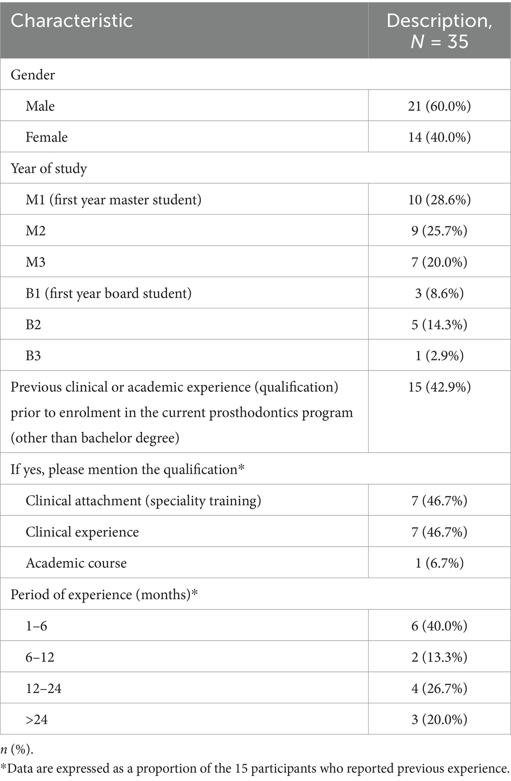 Between 2022 and 2024, the total number of students in the Faculty of Dentistry at King Abdulaziz University was 130 postgraduate students enrolled a cross various academic programs. Of these, 35 students were identified as eligible for inclusion in the present study, as they were enrolled in prosthodontics program. All of the eligible students were contacted via email to participate in the study [21 (60%) male, 14 (40%) female]. Thirteen students were in their first year (M1 n = 10, B1 n = 3), 14 in their second year (M2 n = 9, B2 n = 5), and 8 in their final year of study (M3 n = 7, B3 n = 1). Fifteen students (42.9%) had previous qualifications or clinical experience prior to enrollment in their current postgraduate program (Table 1). Among these, 46.7% had previously undertaken work experience and 46.7% had attended clinical attachments, while one student had previous academic experience. With respect to duration of previous experience, 40.0% had 1–6 months, 13.3% had 6–12 months, 26.7% had 12–24 months, and 20.0% reported >24 months of experience (Table 1).