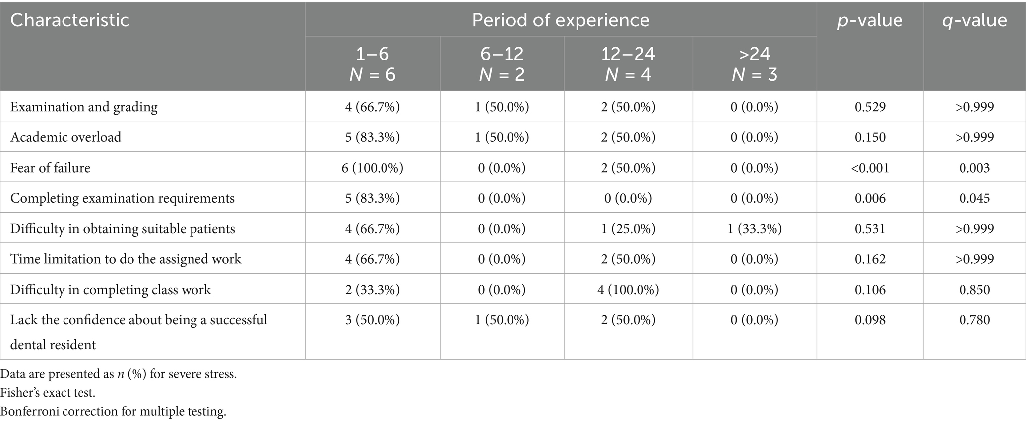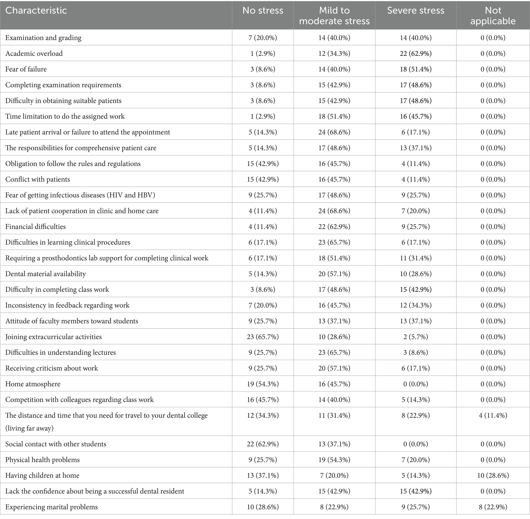 Academic overload and fear of failure were the most prevalent stressors, with 62.9 and 51.4% of participants reporting severe stress in those domains, respectively (Table 2). Other major stressors where ≥40% of participants reported severe stress included completing examination requirements (48.6%), difficulty in finding suitable patients (48.6%), time limitation to complete assigned work (45.7%), difficulty in completing class work (42.9%), lack of confidence about being a successful dental resident (42.9%), and examination and grading (40.0%). The eight domains with ≥40% of participants reporting severe stress were selected for further assessment according to participant characteristics.