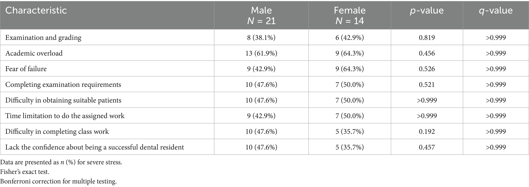 When comparing stress levels by gender for the most reported severe stressors (≥40%), there were no statistically significant differences between males and females after Bonferroni correction (q > 0.999 for all comparisons). Descriptive trends showed that females reported slightly higher levels of severe stress in fear of failure (64.3% vs. 42.9%) and examination and grading (42.9% vs. 38.1%) domains compared with males. Conversely, males reported relatively higher severe stress-related difficulty in completing class work (47.6% vs. 35.7%), and lack of confidence about being a successful dental resident (47.6% vs. 35.7%). Academic overload produced almost similar levels of severe stress in male and female students (61.9% vs. 64.3%, Table 3).