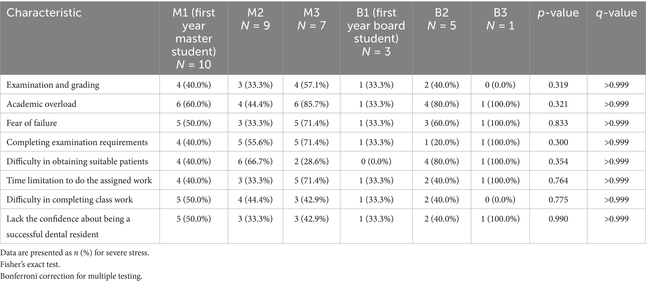 There were no statistically significant differences according to different academic levels in terms of severe stress for any of the examined domains (all q > 0.999). Third-year Master’s students (M3) reported the highest percentage of severe stress in academic overload (85.7%), fear of failure (71.4%), completing examination requirements (71.4%), and time limitation (71.4%) domains; such differences did not reach the statistical significance (p > 0.05, Table 4).