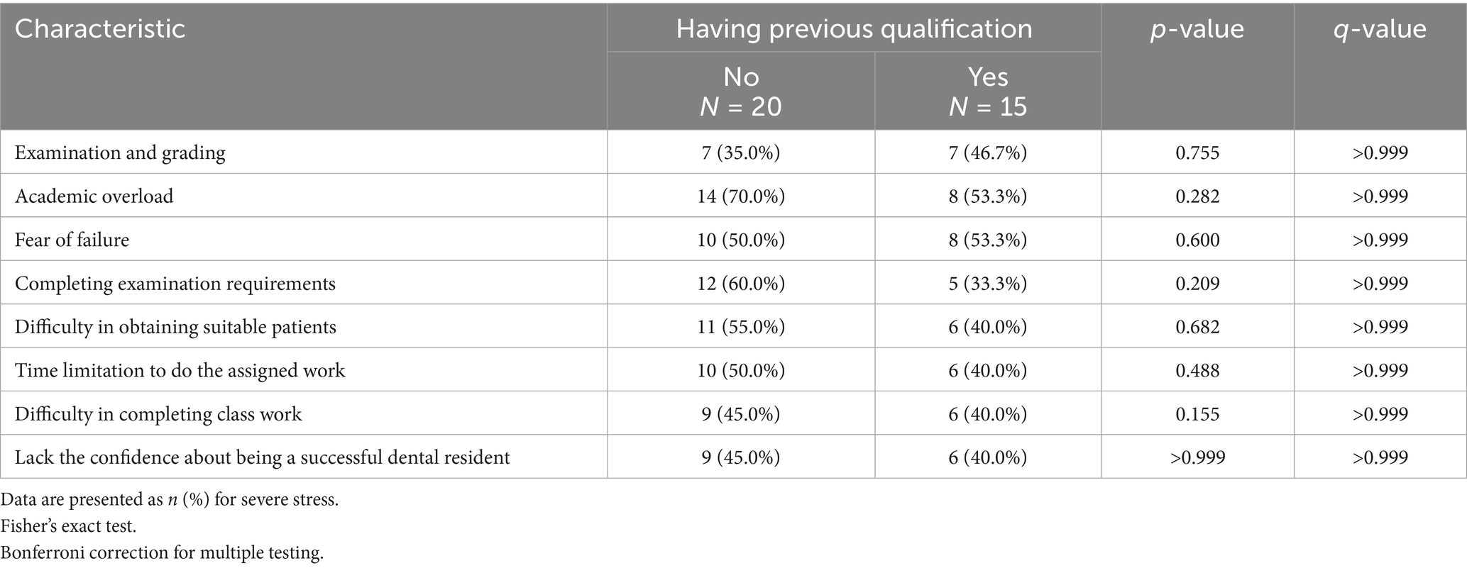 Table 5. Association between having previous clinical or academic experience (qualification) before enrolment in the current prosthodontics program and items showing ≥ 40% severe stress.
