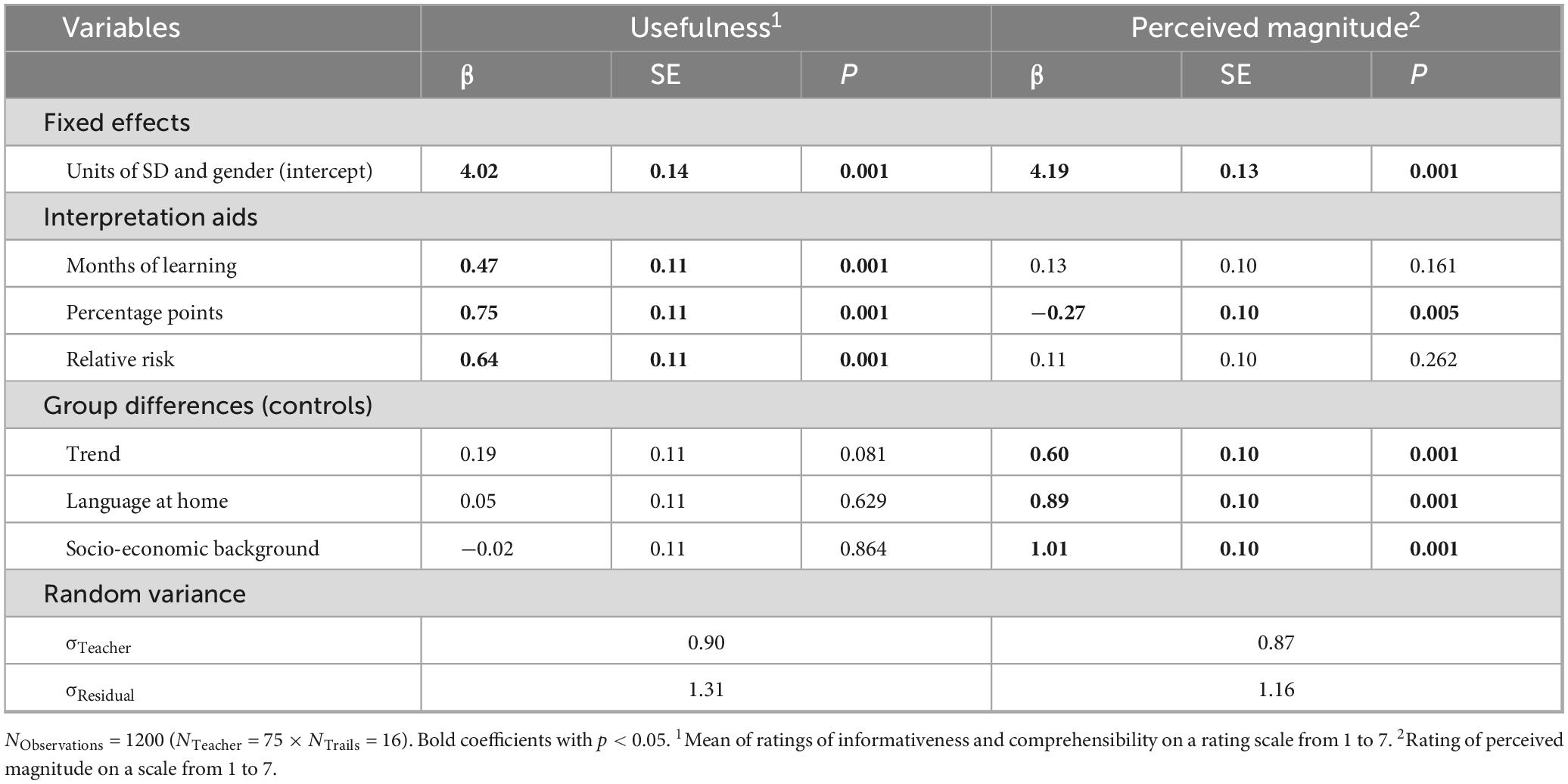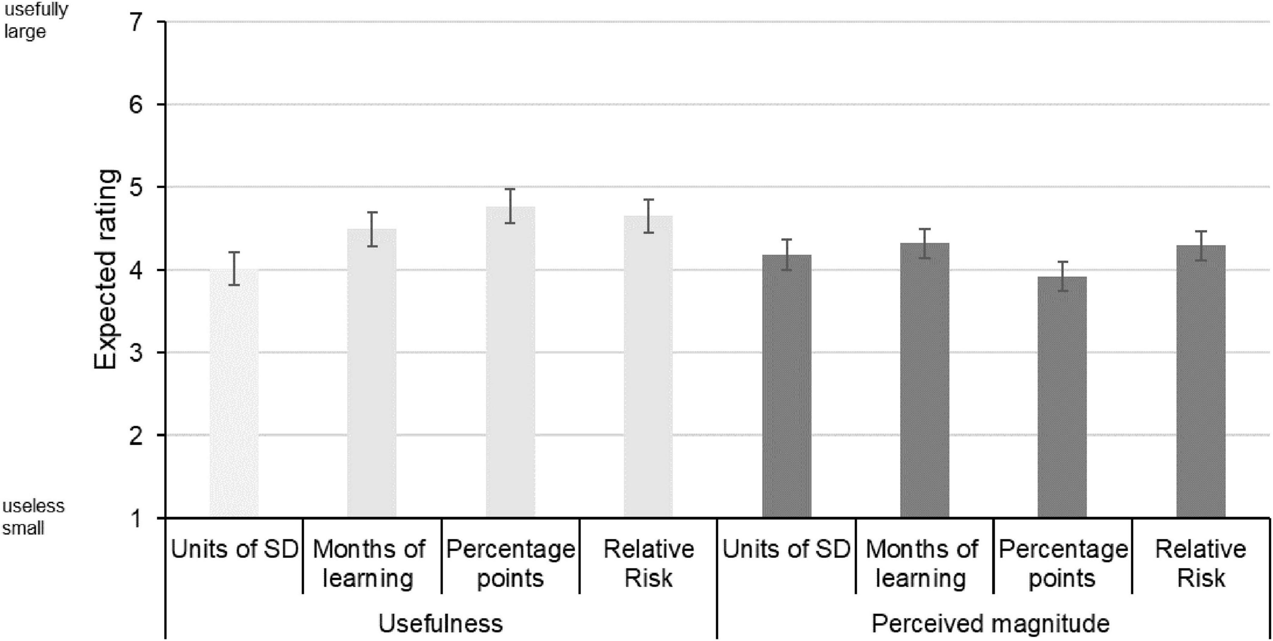 In more detail, we found that in terms of usefulness, units of standard deviation were inferior to months of learning (β = 0.47, t = 4.43, p < 0.001), percentage points (β = 0.75, t = 7.03, p < 0.001), and relative risk (β = 0.64, t = 5.94, p < 0.001). Additionally, percentage points were superior to months of learning (β = 0.28, t = −2.60, p = 0.011). In terms of perceived magnitude, the percentage points were perceived to be smaller in magnitude than units of standard deviation (β = −0.27, t = 2.81, p = 0.007), months of learning (β = −0.40, t = 4.21, p < 0.001), and relative risk (β = −0.37, t = 3.93, p < 0.001).