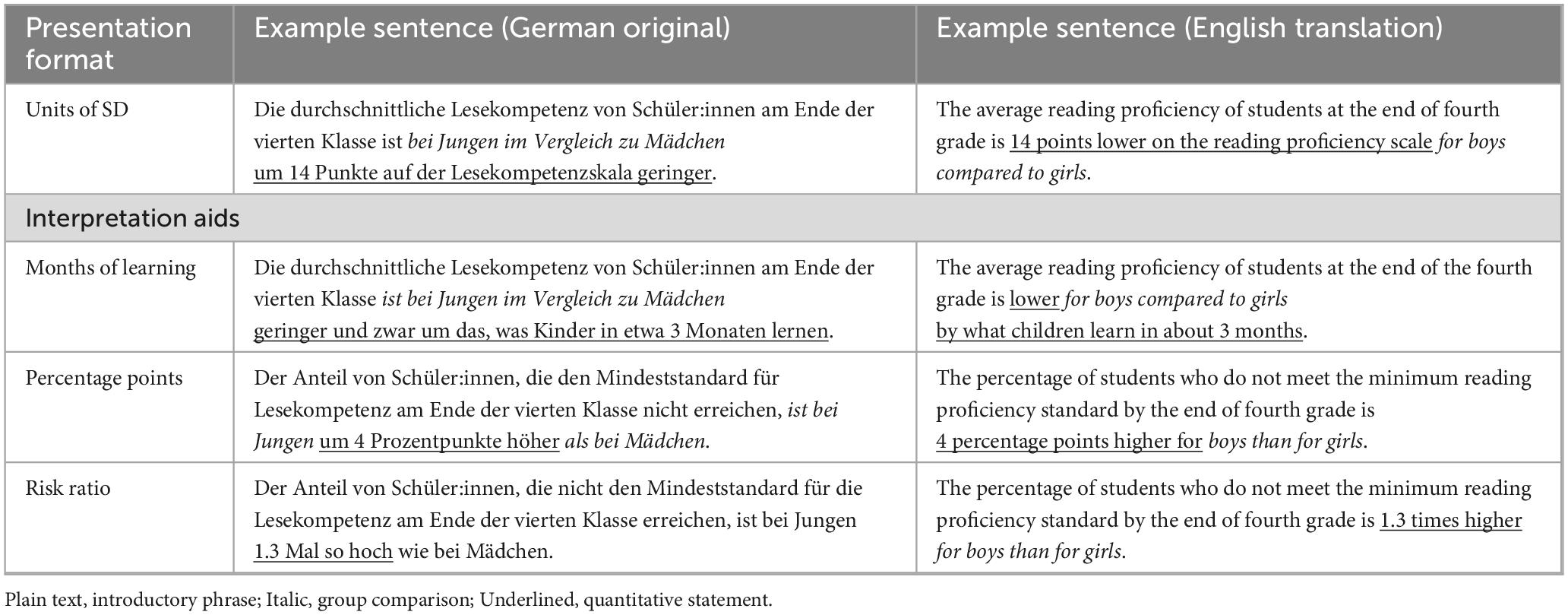 The vignettes were phrased in a standardized way to ensure comparability between the different interpretation aids (see Table 1). The formulation of each vignette consisted of an introductory phrase (e.g., “The average reading proficiency of students at the end of fourth grade is,” plain text), a phrase to clarify the specific group difference (e.g., “for boys compared to girls,” italic) and the interpretation aid used (e.g., “14 points lower on the reading proficiency scale,” underlined).