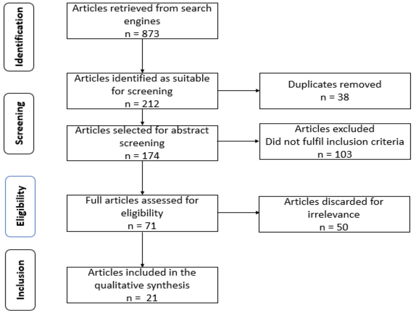 Following the PRISMA principles, 873 articles were identified from the four selected search engines, of which 212 were deemed suitable. An additional 38 duplicates were removed, leaving 174 papers available for abstract screening. Furthermore, a total of 103 articles were excluded for not meeting the highlighted inclusion criteria. After applying the inclusion and exclusion criteria, 71 articles were found to meet the requirements for further examination. However, upon closer inspection, it was determined that 50 articles were unrelated to the topic of this study. Ultimately, 21 publications were evaluated. A graphical representation is shown in Figure 1 below: