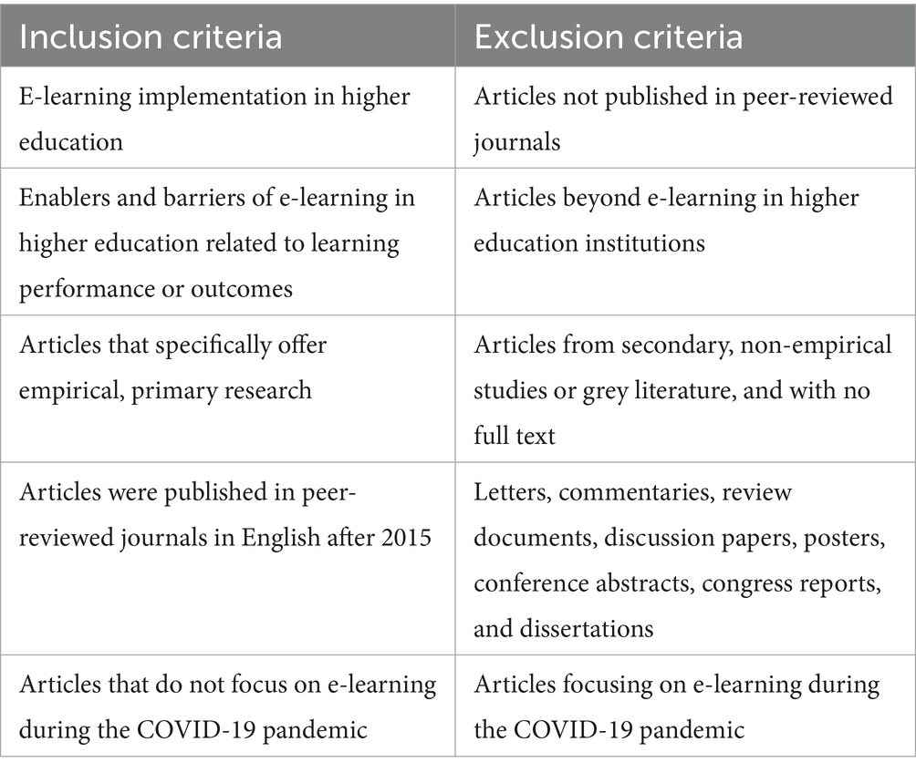 This study employed a systematic literature review (SLR) methodology. Systematic literature reviews are regarded as a significant research methodology that adheres closely to scientific principles, as they are “designed to locate, appraise, and synthesize the best available evidence” pertinent to the research objective, thereby facilitating “informative and evidence-based” findings (Dickson, 2017; Boland et al., 2023). A systematic search for articles published on e-learning in higher education institutions was conducted in JSTOR, Scopus, ERIC, and ScienceDirect from 2015 to 2025. The primary search terms were “e-learning” and “higher education,” using ‘Textword searching’ (i.e., searching for a word or phrase appearing anywhere in the citation—article title, journal name, author, etc.) rather than the full text of an article, and ‘Thesaurus (LCSH, AACE) searching’, employing Boolean operators and truncations. The search strategy included the following terms: (“e-learning” OR “online learn*” OR “distance learning” OR “computer-assisted instruction” OR “web-based learning” OR “internet-based learning” OR “multi-media learning” OR “technology-enhanced learning” OR “distributed learning” OR “virtual classroom” OR “virtual environment” OR “virtual learning”) AND (“higher education institution” OR “higher education” OR “tertiary education” OR “postsecondary education” OR “advanced education” OR “graduate education” OR “public further education” OR “university education”) AND (“challenges” OR “barriers” OR “enablers” OR “facilitator”) (see Table 1).