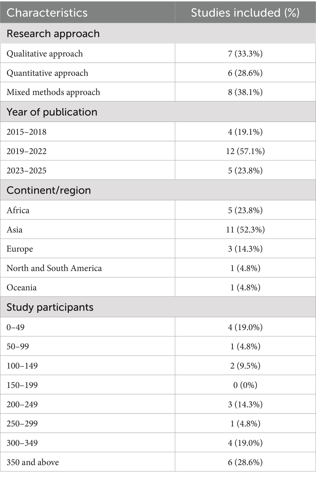 According to the final search results, 21 papers were identified for inclusion in the review, predominantly of a quantitative nature. Thus, Clarke (2007) contends that when methodological heterogeneity exists, “systematic review does not require the amalgamation of study results to yield an average estimate.” This study synthesised data through narrative synthesis employing thematic analysis (TA) (Regmi and Jones, 2020). Thematic Analysis is defined as “a method […] for identifying, analysing, and reporting patterns (themes)” or for seeking meaning within literature or data (Ritchie et al., 2003). In this study, we employed six steps to identify recurrent themes while synthesising data through thematic analysis: familiarising ourselves with the data, developing initial (sub) codes, searching for (sub) themes, reviewing (sub) themes, charting or compiling ideas or issues, and producing final data aligned with the study’s aims and objectives (Ritchie et al., 2003; Regmi and Jones, 2020). Thereafter, a table was created to delineate the characteristics of the studies, including designs, techniques, and populations (see Table 2). Two researchers engaged in the processes and independently assessed each article, yielding an inter-rater reliability of 78% as determined by Cohen’s kappa coefficient (Creswell and Poth, 2016; Salas-Pilco et al., 2022). Disputes were resolved by deliberation until a consensus was reached. Therefore, Petticrew and Roberts (2008) assert that this would enhance transparency by elucidating the types of data taken from various studies and acknowledging the contribution of each study to the overall synthesis.