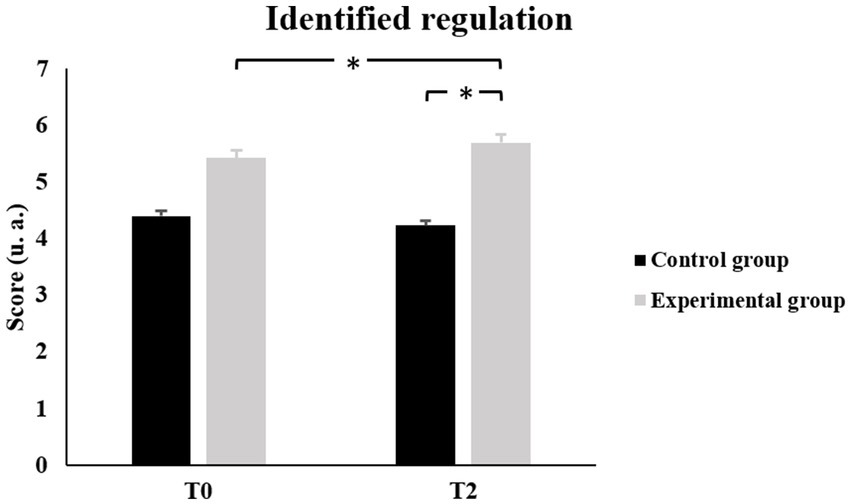 Figure 3 reveals that identified regulation increased in the experimental group from T0 to T1, but it declined in the control group during the same time period; Statistical results revealed a significant group effect (F(1.49) = 17.42; p < 0.001; ηp2 = 0.26) but no significant effect of learning (F(1.49) = 0.04; p = 0.851; ηp2 = 0.00) or group-learning interaction (F(1.49) = 0.68; p = 0.413; ηp2 = 0.01).