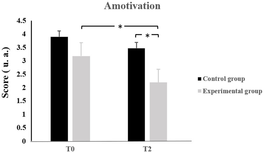 Figure 5 illustrates that amotivation decreased in the experimental group between T0 and T1, but it increased in the control group over the same period. Statistical results revealed a significant group effect (F(1.49) = 20.89; p < 0.001; ηp2 = 0.30) and a significant learning effect (F(1.49) = 8.81; p = 0.005; ηp2 = 0.15) but no significant group-learning interaction effect (F(1.49) = 1.34; p = 0.252; ηp2 = 0.03).