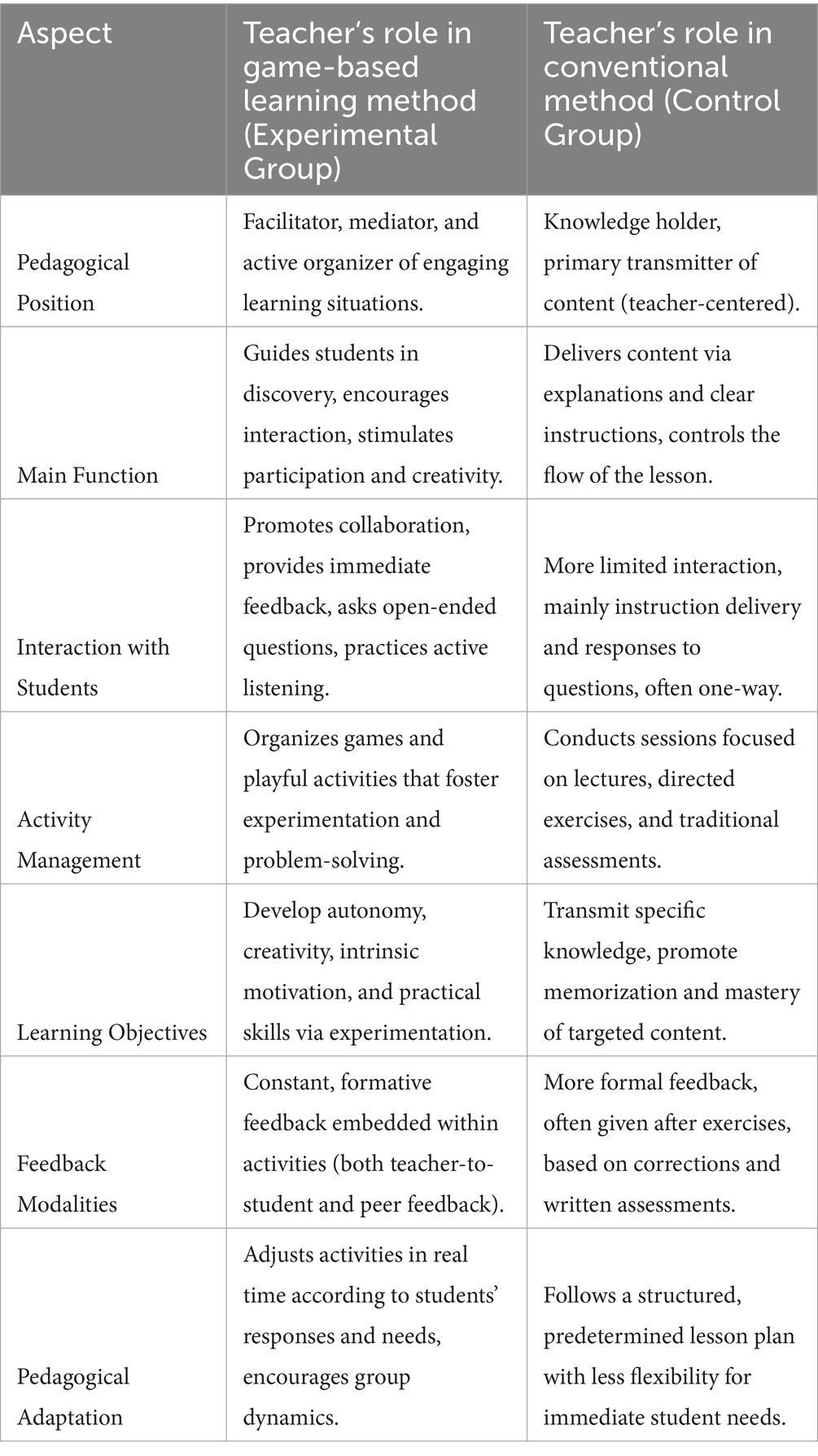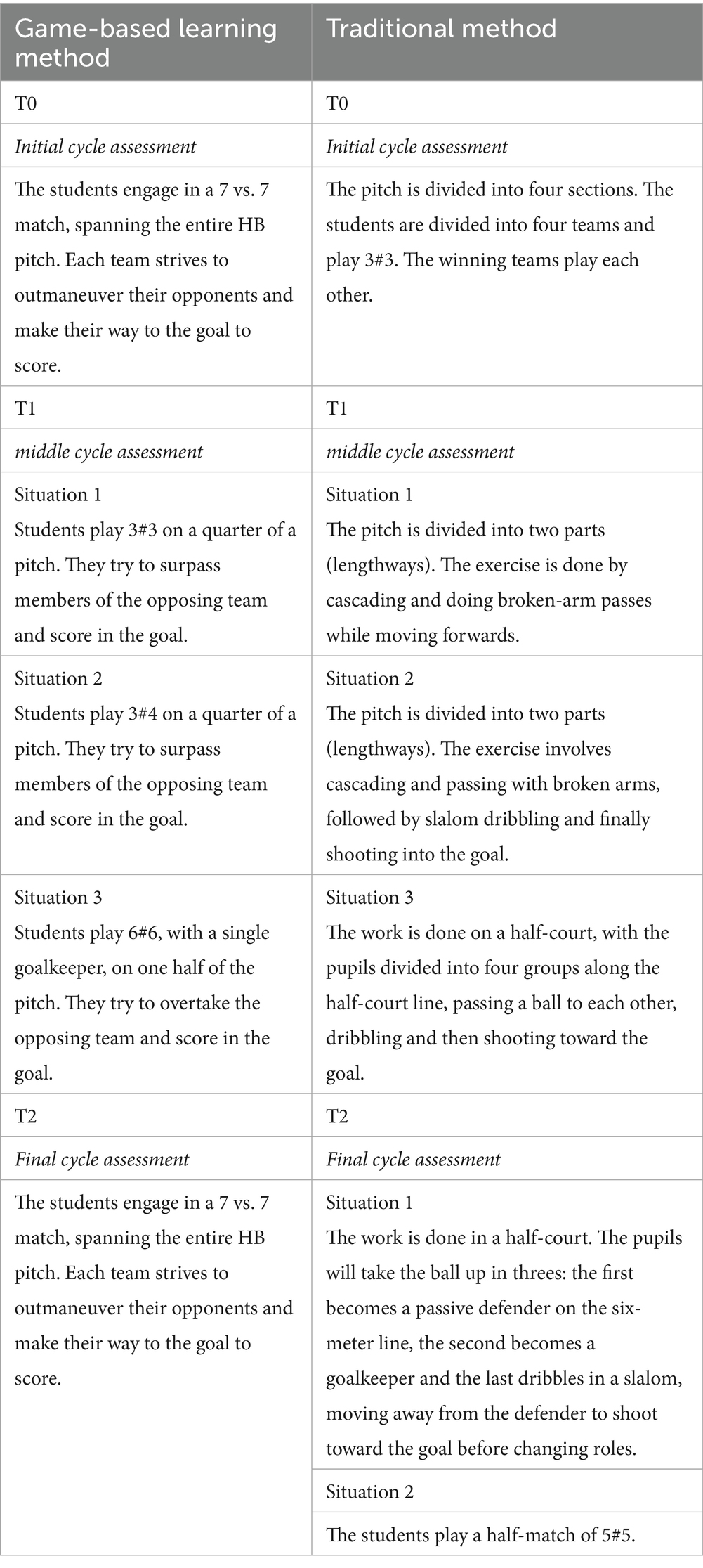 Participants were randomly assigned to one of two groups. As detailed in Tables 1, 2, the experimental group received instruction based on a GBL method, which encourages active participation through play. In contrast, the control group was taught using conventional methods as typically applied in this school context. These methods were characterized by direct instruction, teacher-led demonstrations, and structured drills, with limited opportunities for student interaction. This instructional approach, observed during the study, reflects a traditional, teacher-centered pedagogy widely described in PE literature, where the teacher acts as the primary source of knowledge and learners tend to adopt a more passive role (Ali et al., 2010; Nid and Dakhia, 2021; Metzler, 2017). Throughout the intervention, the teacher followed standardized lesson plans co-developed with the research team to ensure methodological consistency. Additionally, all sessions were video recorded and later analyzed using the Learning Time Analysis System (LTAS) to monitor fidelity to the GBL framework and verify alignment between intended and observed instructional practices.