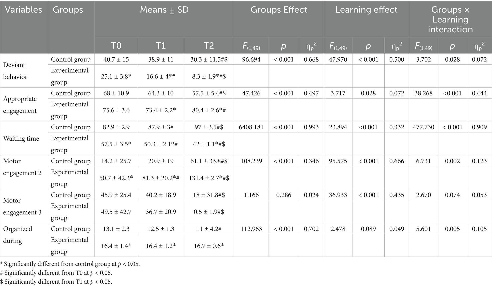 For deviant behavior, Table 3 demonstrates that the experimental group showed significantly fewer instances of disruptive behavior than the control group at all three time intervals (T0, T1, and T2; all p < 0.001). Both groups demonstrated significant reductions in deviant behaviors at T1 and T2 when compared to T0 (p < 0.001). The analysis of variance (ANOVA) showed a significant main effect for group, demonstrating that the teaching method influenced behavior. The analysis revealed a significant main effect for learning. The interaction between group and learning was also significant.