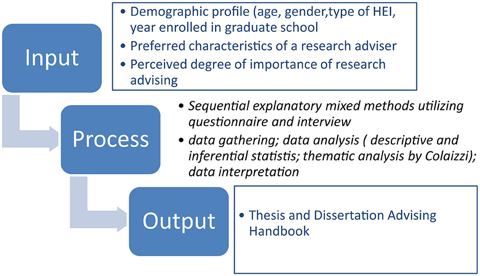 The Input-Process-Output (I-P-O) schematic diagram of the research process is given in Figure 2. The demographic profile of the graduate students serves as the input together with their preferred characteristics of a research adviser and their perceived importance of research advising.