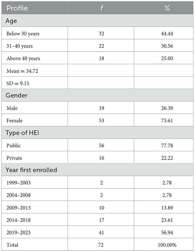 In this study, 72 graduate students participated, coming from HEIs in Cebu and Palawan, Philippines. Their demographic profile is presented in Table 1.