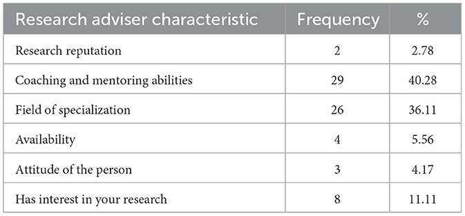 The key findings for the second objective of the study, which is to identify the specific attributes that graduate students prioritize when selecting their thesis or dissertation advisers, are presented in this section, are given in Table 2. The results provide insights into the qualities students deem most important, such as field of specialization, research reputation, coaching and mentoring abilities, availability, interest in your research, and attitude. By examining these results, a deeper understanding of how students navigate the advising process and the characteristics that contribute to a productive and positive advising relationship is gained.