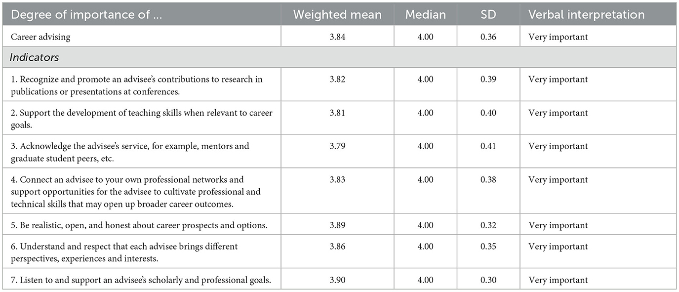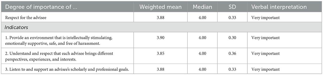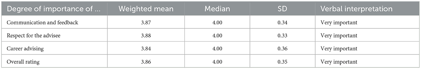 The following section presents the research results of the third objective of the study, which is to determine the degree of importance attributed to various constructs of research advising, such as communication and feedback, respect for the advisee, and career advising. Table 3 displays these results. The findings highlight the weight that respondents place on these different aspects of the advising relationship, offering insights into which characteristics are considered most critical by students when selecting a research adviser. By understanding these preferences, the graduate student may be greatly helped in the research journey leading toward completion and graduation.