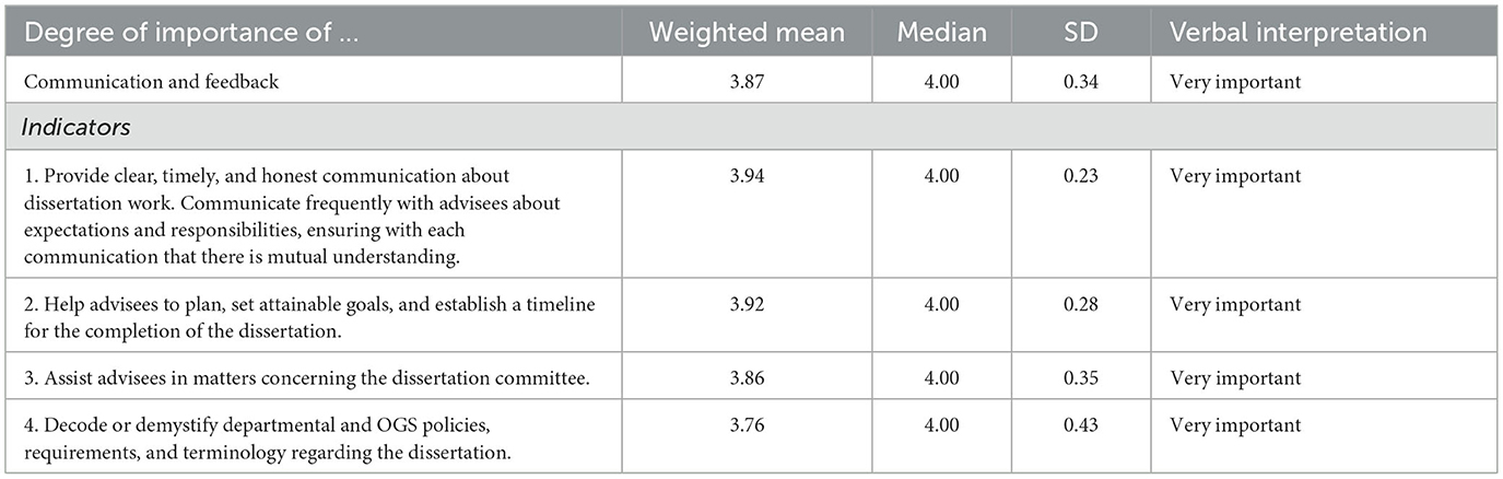 The importance of communication and feedback was given an overall mean rating of 3.87, a median of 4.00, and interpreted as Very Important. The computed standard deviation SD is 0.34, interpreted as exceptionally small. The graduate students' responses are consistent and in consensus. The research findings emphasize that students highly value advisers who communicate effectively and provide regular, actionable feedback, as these elements are key to a productive and positive advising relationship. Among the indicators, providing clear, timely, and honest communication about dissertation work was rated highest, with 3.94, interpreted as Very Important. Meanwhile, decoding or demystifying departmental and graduate policies, requirements, and terminology regarding the dissertation was given the least rating of 3.76, still considered Very Important. This could be so considering that the graduate students trust these guidelines to their research advisers to help them each and every step of the way.