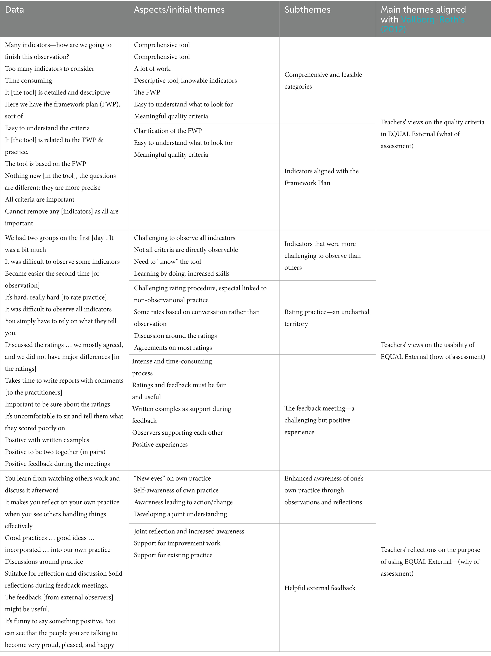 While the terms “assessment” and “evaluation” are often used interchangeably in the literature, we use the former in this article. Assessment can be related to the individual, the group, and the activity level, which are the areas of focus of the current study, whereas evaluation can be related to the institutional, system, or program level (Vallberg-Roth, 2012). Assessment can further be understood as a pedagogical approach that can include questions such as what, how, and why (Vallberg-Roth, 2012, see also Bjørnestad et al., 2019). The present study focuses on teachers’ perceptions of the feasibility of the EQUAL external, more accurately the clarity of the tool (linked to what of assessment), the usability of the tool (linked to how of assessment), and the underlying justification for its use (linked to why of assessment) (Vallberg-Roth, 2012).