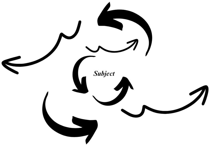 Figure 1 illustrates the systematic and recursive process of racial subject formation through the dual operations of interpellation and apperception. The outer arrows represent interpellation’s external forces, such as social, institutional, and ideological structures that “hail” individuals into racialized legibility. These outer forces persistently position the subject into systemic recognition through externalized ascriptions. The inner arrows signify apperception, as the internal process through which the subject understands themself. Through apperception, the subject internalizes stereotypes, self-surveils along prescribed and self-ascribed definitions, and employs strategies of resistance and negotiation. This diagram visualizes how racialization is the incessant interplay of external and internal forces that the subject encounters daily. Racialization, through apperception and interpellation, is like the air we breathe; it surrounds us constantly to shape us and our environment. We externalize and internalize race with each exhalation and inhalation.