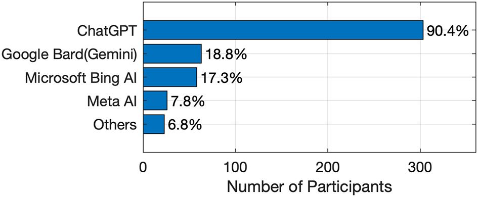 A comparison of Figures 1, 2 reveals that although many participants are aware of other prominent AI tools, such as Microsoft Bing AI chatbot, Google Bard (Gemini), and Meta AI, they do not rely on them as heavily as they do on ChatGPT for completing tasks. Several factors may explain this preference: ChatGPT's earlier introduction, which has led to greater familiarity among students; its superior performance and capabilities (Al Mashagbeh et al., 2024); and its more user-friendly interface, which makes it more accessible compared to other tools (Tabone and De Winter, 2023).