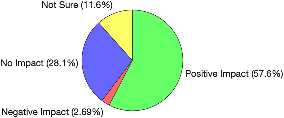The encouraging news is that when participants were asked whether the use of AI tools had impacted their academic performance, 57.6% responded positively, as shown in Figure 4. Only 2.7% believed these tools had a negative effect, while 28.1% indicated that AI had no impact on their performance. The remaining participants were unsure. While these results are promising, further investigation is needed to determine whether students perceive this positive impact due to an actual improvement in understanding or because AI tools enable them to complete homework and assignments more efficiently, with minimal time investment and potentially without deep comprehension.