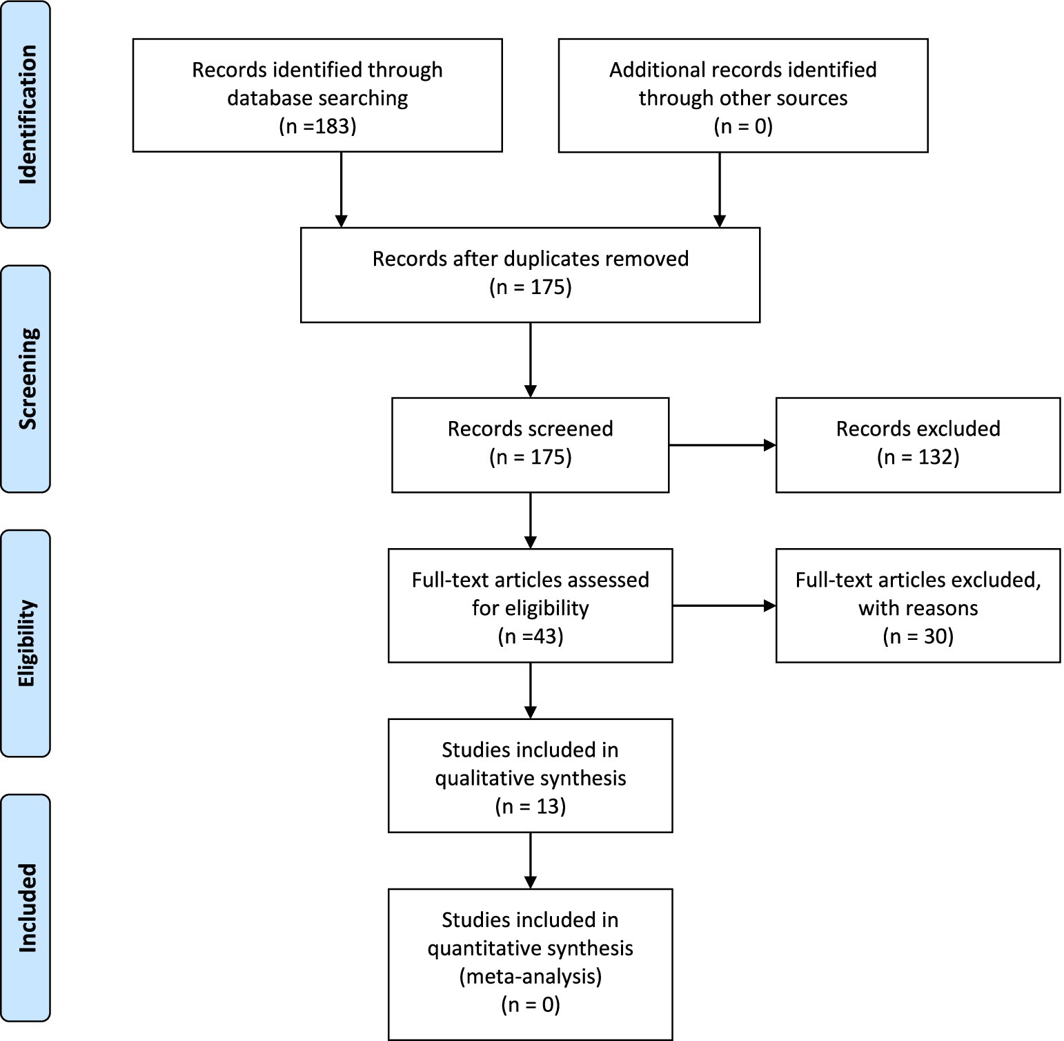 Studies were included if they focused on the use of technological advancements for clinical teaching and learning in audiology, particularly those implemented or adapted in response to the COVID-19 pandemic. The focus was on the South African context, though relevant studies from other regions were also included for relevant comparative insights. Studies that explicitly discussed the use of digital technologies, such as tele-audiology, virtual simulations, or online CPD; were published between 2020 and 2024; and were accessible in English were included. Studies that focused exclusively on traditional, face-to-face (in-person interventions) teaching methodologies with no reference to technological interventions, as well as studies unrelated to audiology or clinical education were excluded. Additionally, opinion pieces, commentaries or editorials without empirical or theoretical or conceptual analysis; and studies that fell outside the scope of audiology or closely related speech-language professions were excluded. A total of 183 studies were identified through the initial search process. After screening titles and abstracts, 43 full-text articles were reviewed for relevance, of which 13 met the inclusion criteria and were included in the qualitative synthesis. Studies were excluded if they did not address technological advances in audiology education or clinical practice during/following covid-19, if they lacked sufficient detail on outcomes, or if they focused solely on face-to-face interventions. A PRISMA-style flow diagram (Figure 1) summarizes the study selection process.