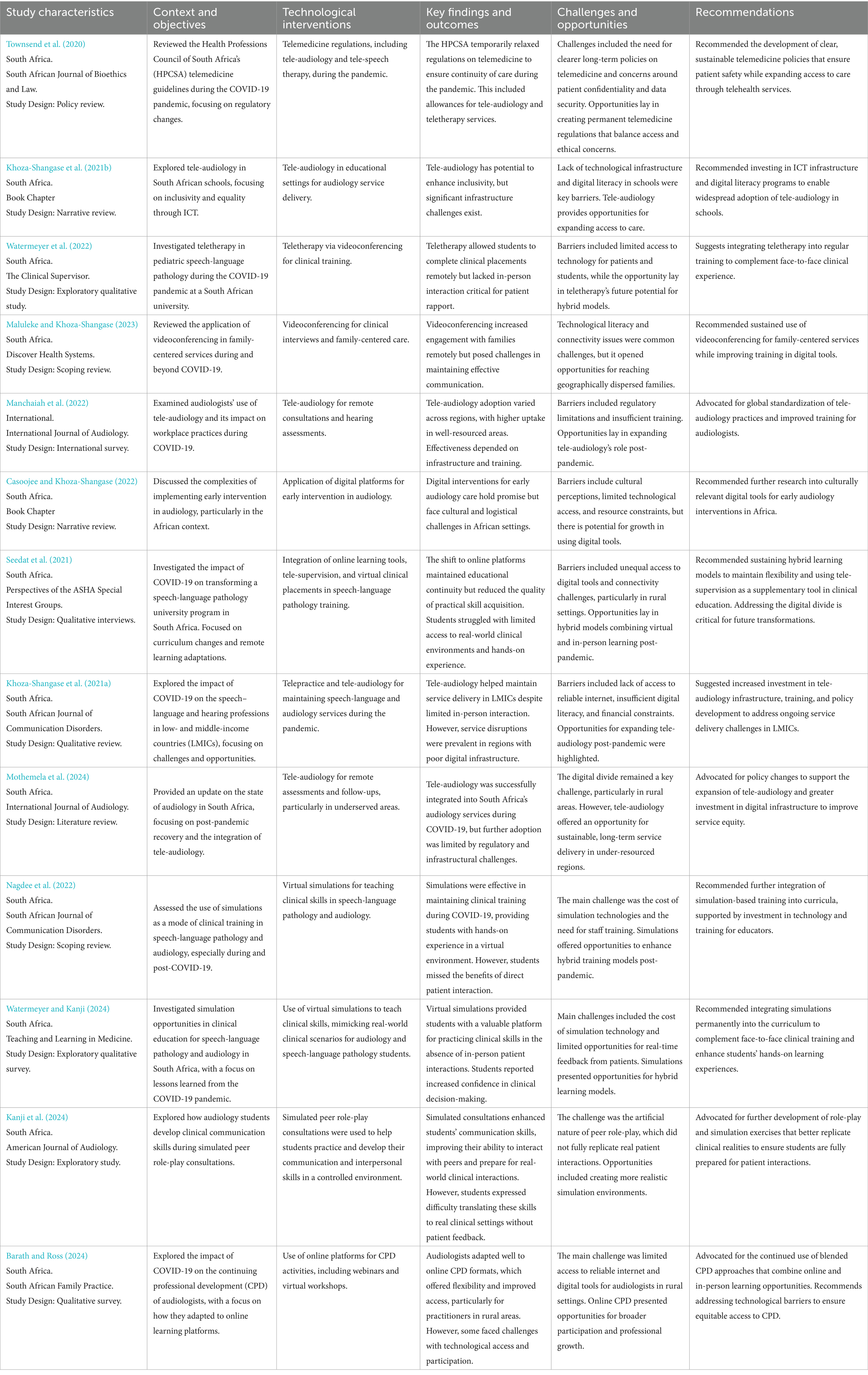 The studies included in this narrative review represent a diverse range of methodologies, settings, and populations, providing a comprehensive perspective on the use of technological advancements in audiology education and practice during the COVID-19 pandemic. The evidence spans qualitative reviews, scoping reviews, literature reviews, and policy reviews, reflecting both empirical and theoretical approaches to understanding the impact of these technologies. Most studies were conducted in South Africa, with a focus on the South African academic and healthcare systems, but a few extended their scope to include insights from other low- and middle-income countries (LMICs) (Khoza-Shangase et al., 2021b; Mothemela et al., 2024). The evidence base also includes insights from health policy reviews, such as the one conducted by Townsend et al. (2020), which focused on regulatory frameworks for telemedicine in South Africa during the pandemic. The settings of these studies primarily involved academic institutions and clinical service delivery environments, particularly those utilizing tele-audiology, virtual simulations, and online platforms for professional development.